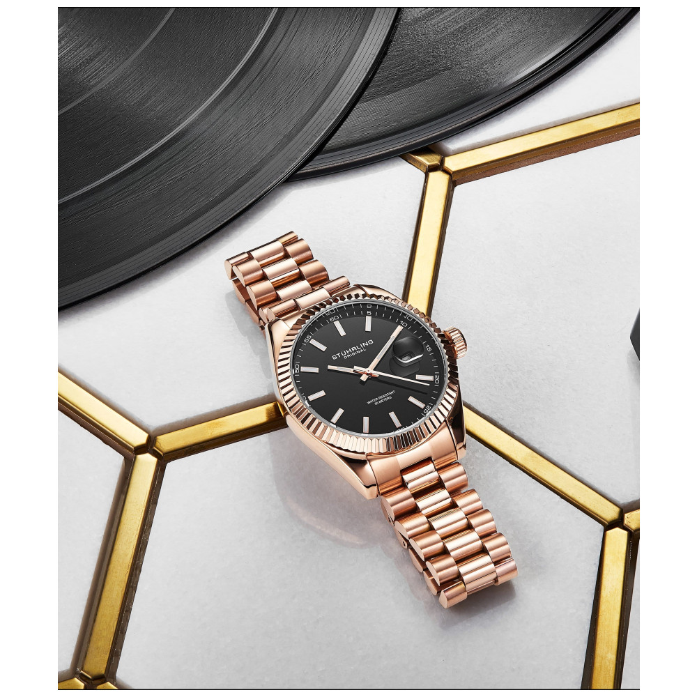 Relgio Stuhrling Lineage 3935 42mm com mostrador preto e pulseira em ao inox rosa: O Relgio Stuhrling Lineage 3935 um produto de alta qualidade com um design sofisticado e elegante.