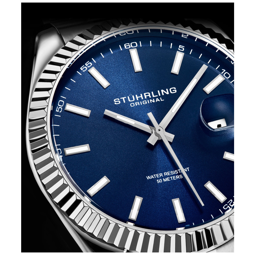 Relgio Stuhrling Lineage 3935 Clssico 42mm, Mostrador Azul e Pulseira de Ao Inoxidvel Prata