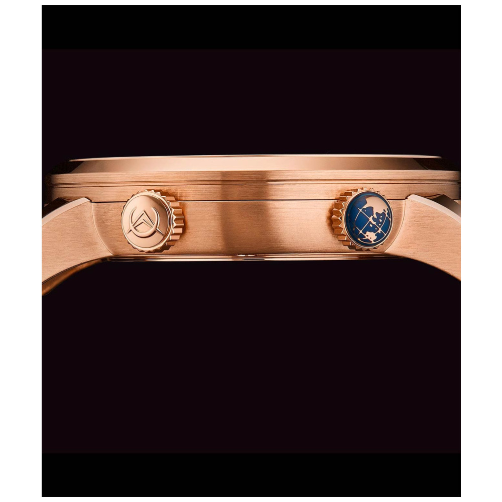 Alimentado por um movimento suo Ronda 515, com movimento 24 GMT, este relgio um companheiro ideal para viajantes globais.