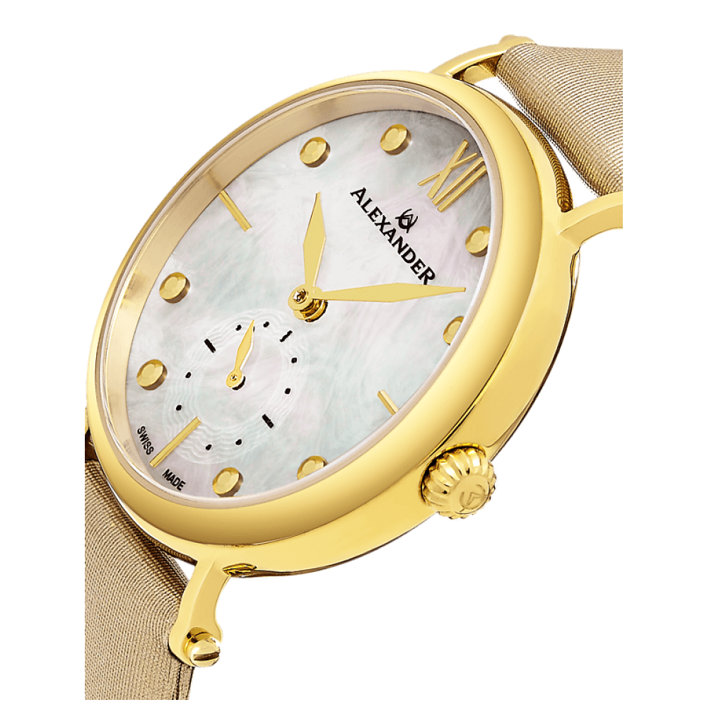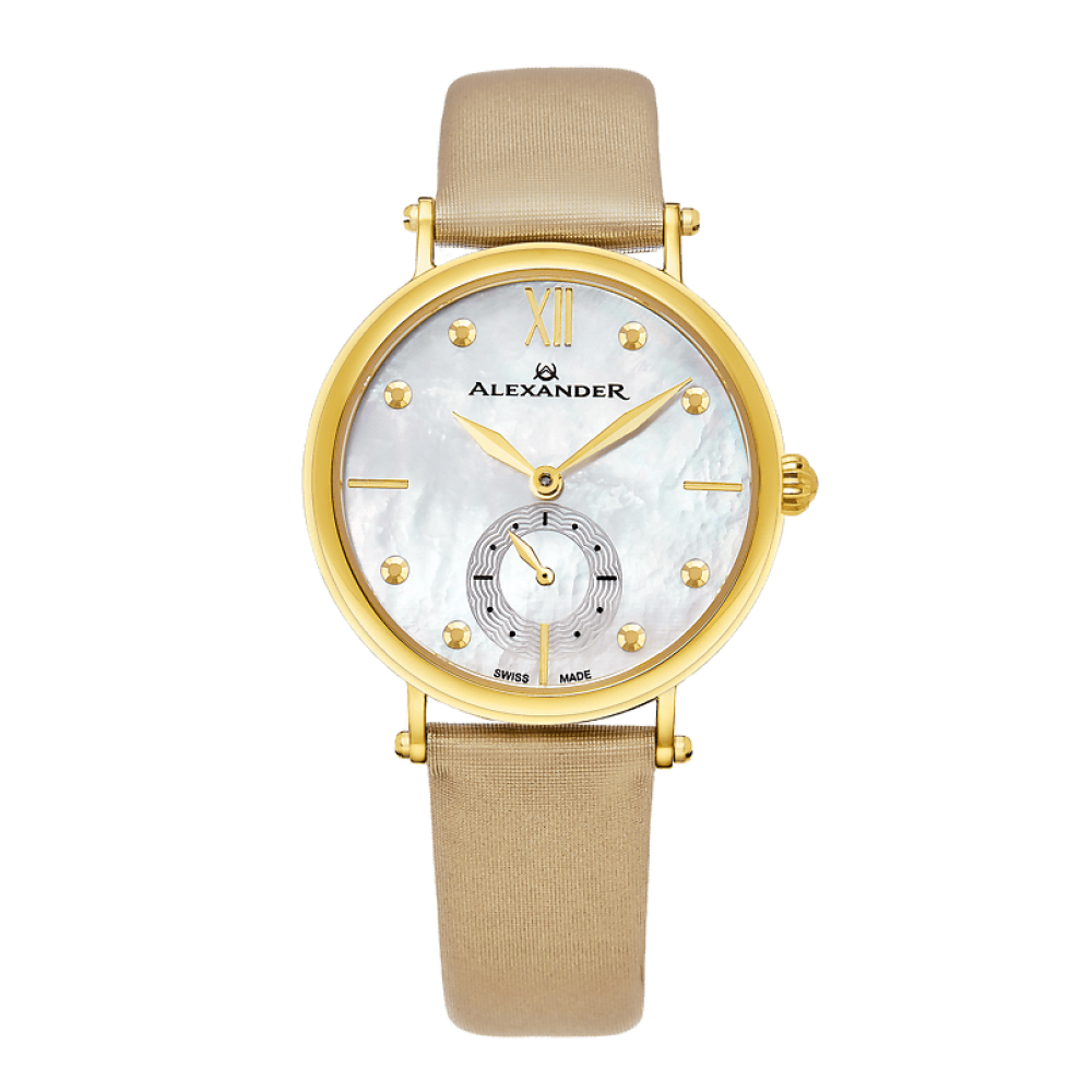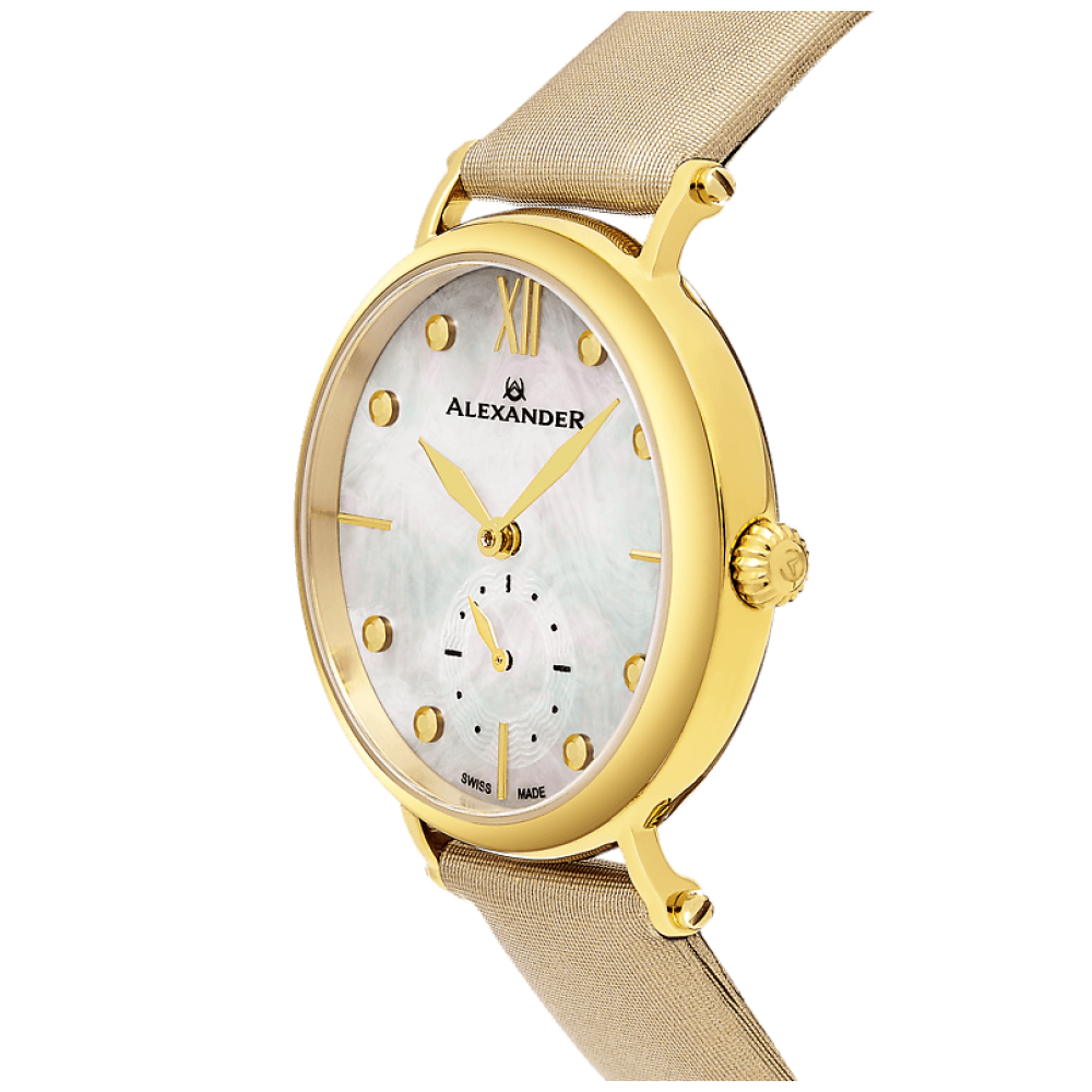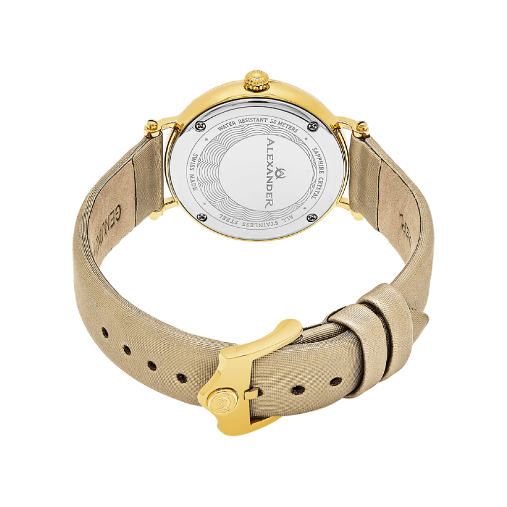 Com sua caixa em ao inoxidvel em tom de ouro amarelo e pulseira de cetim dourado, ele apresenta um design moderno e sofisticado.