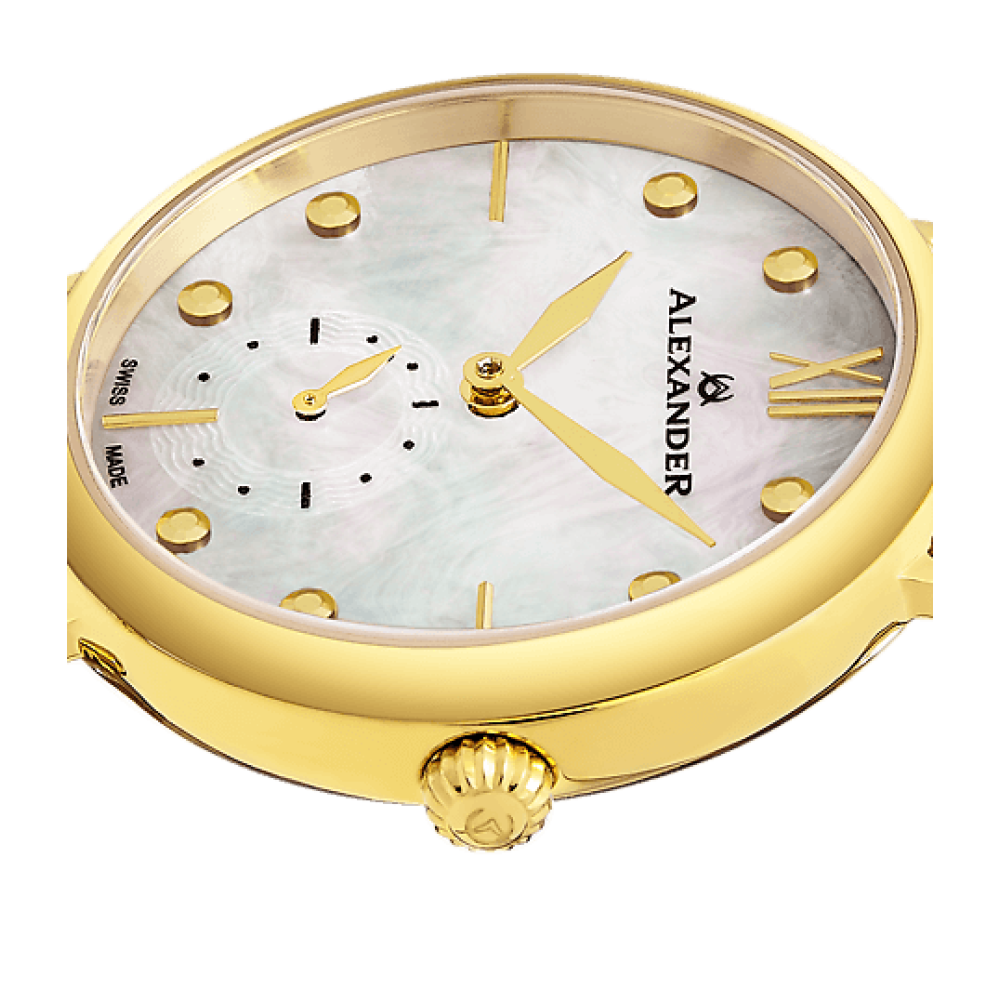O mostrador em madreprola branca adiciona um toque de elegncia e sofisticao, enquanto os pequenos segundos adicionam um toque de funcionalidade.