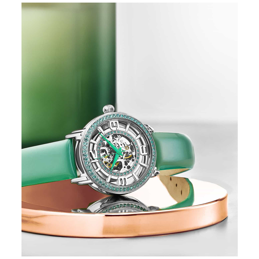 Com um tamanho de 38 mm, o mostrador prateado esqueletizado é adornado com cristais deslumbrantes, criando uma exibição impressionante do movimento exposto.