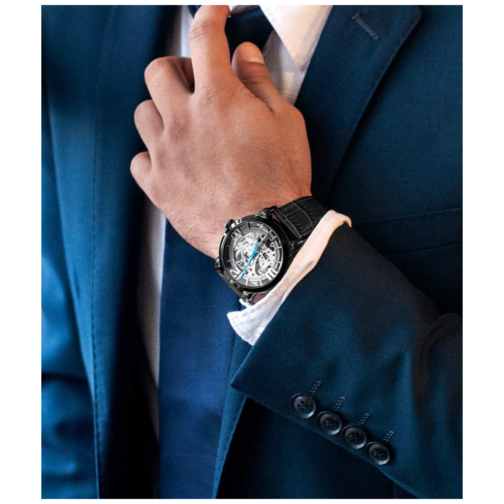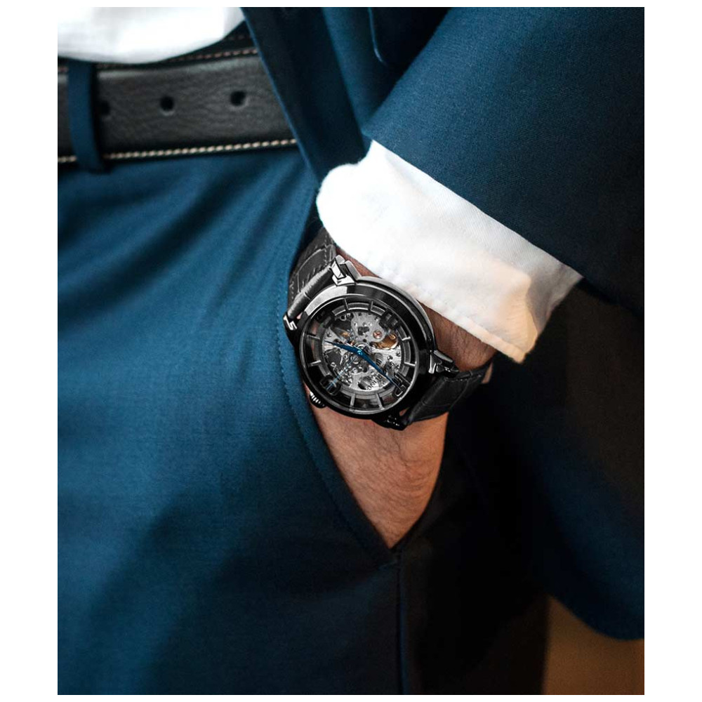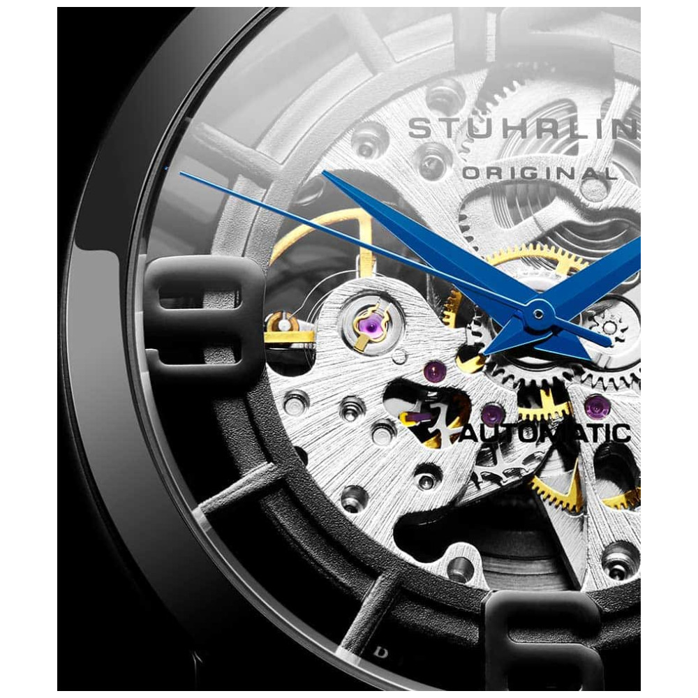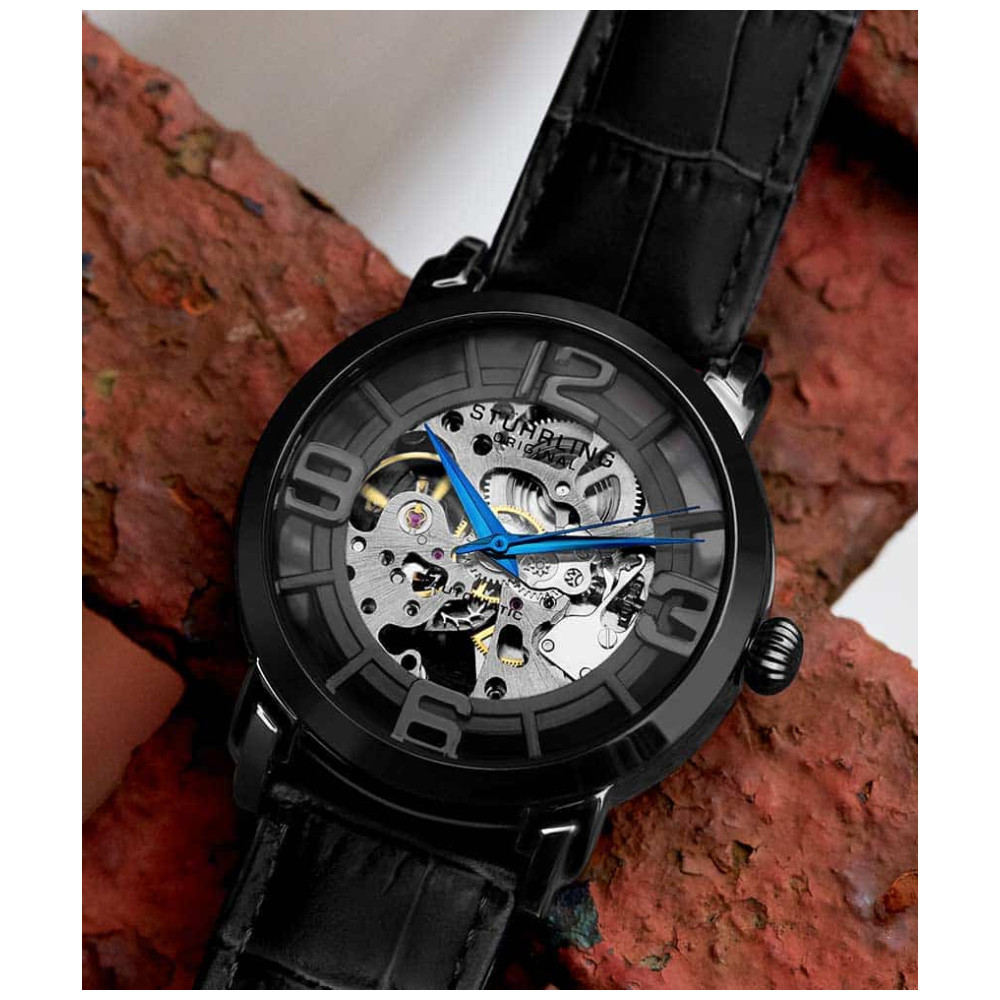 O Relógio Automático Winchester 3964L da Stuhrling é uma peça de alta qualidade e elegância. Com um mostrador preto totalmente esqueletizado e uma moldura externa, os ponteiros azu…