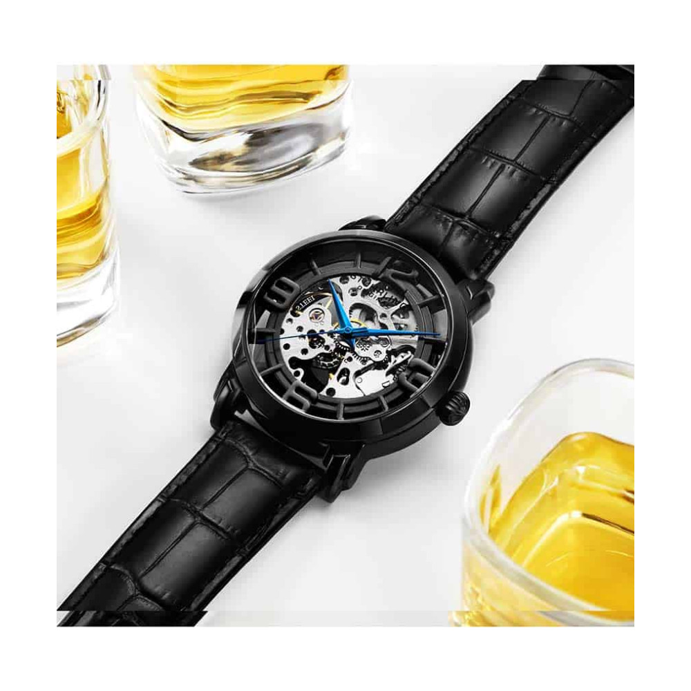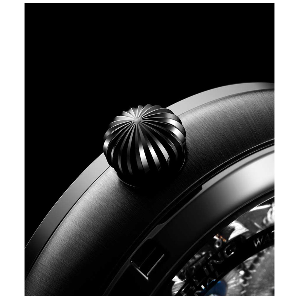 Com um mostrador preto totalmente esqueletizado e uma moldura externa, os ponteiros azulados estilo Dauphine se destacam, garantindo uma leitura precisa e fácil do tempo.
