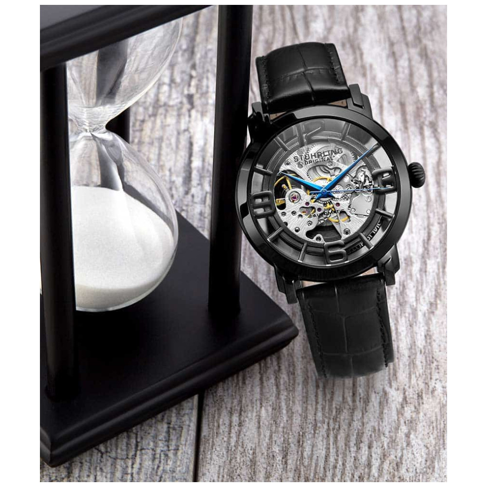 Relógio Automático Winchester 3964L de 42mm com Mostrador Preto, Pulseira de Couro Preta e Fivela Tang Preta, da Stuhrling.