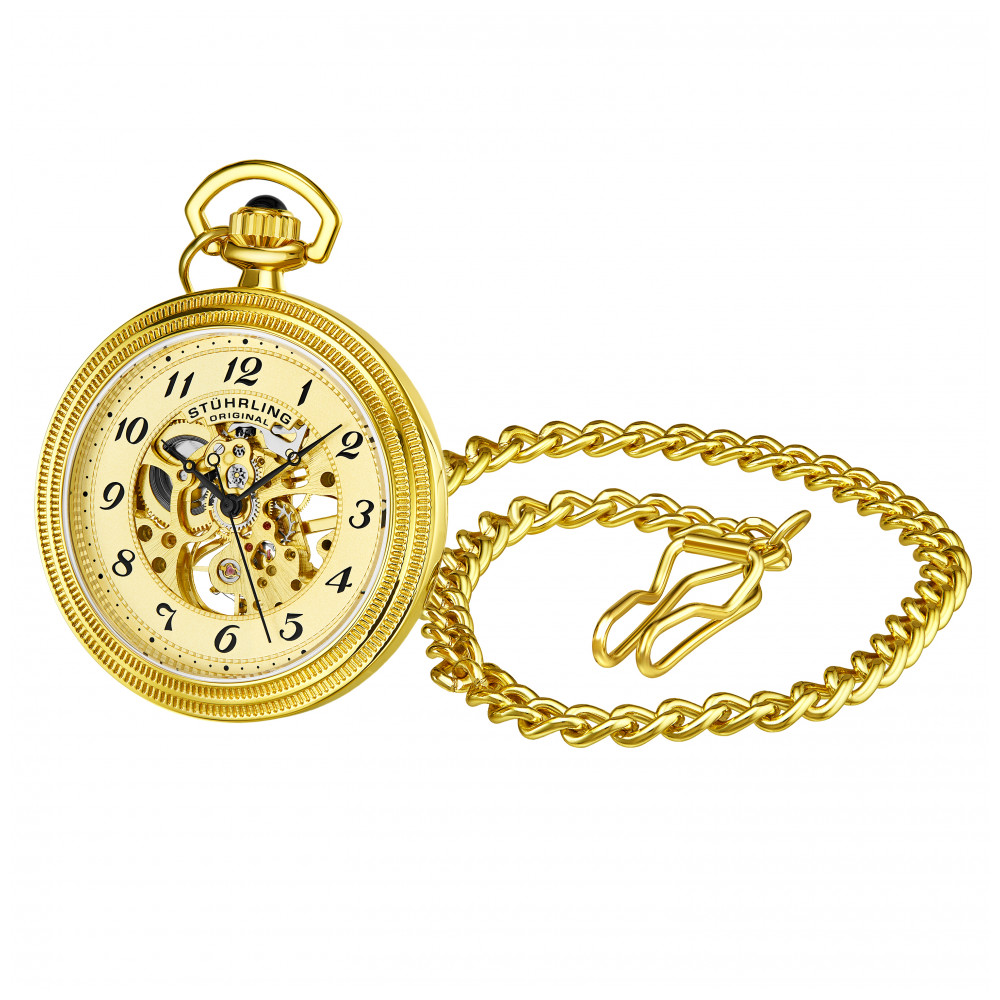 Relógio de Bolso Masculino Stuhrling Provost 980 de Corda Manual, Dourado: Tamanho da Caixa 48mm Resistente à água 5 ATM 50 metros, 165 pés Moldura com design de degraus arredondados polidos corrente de aço