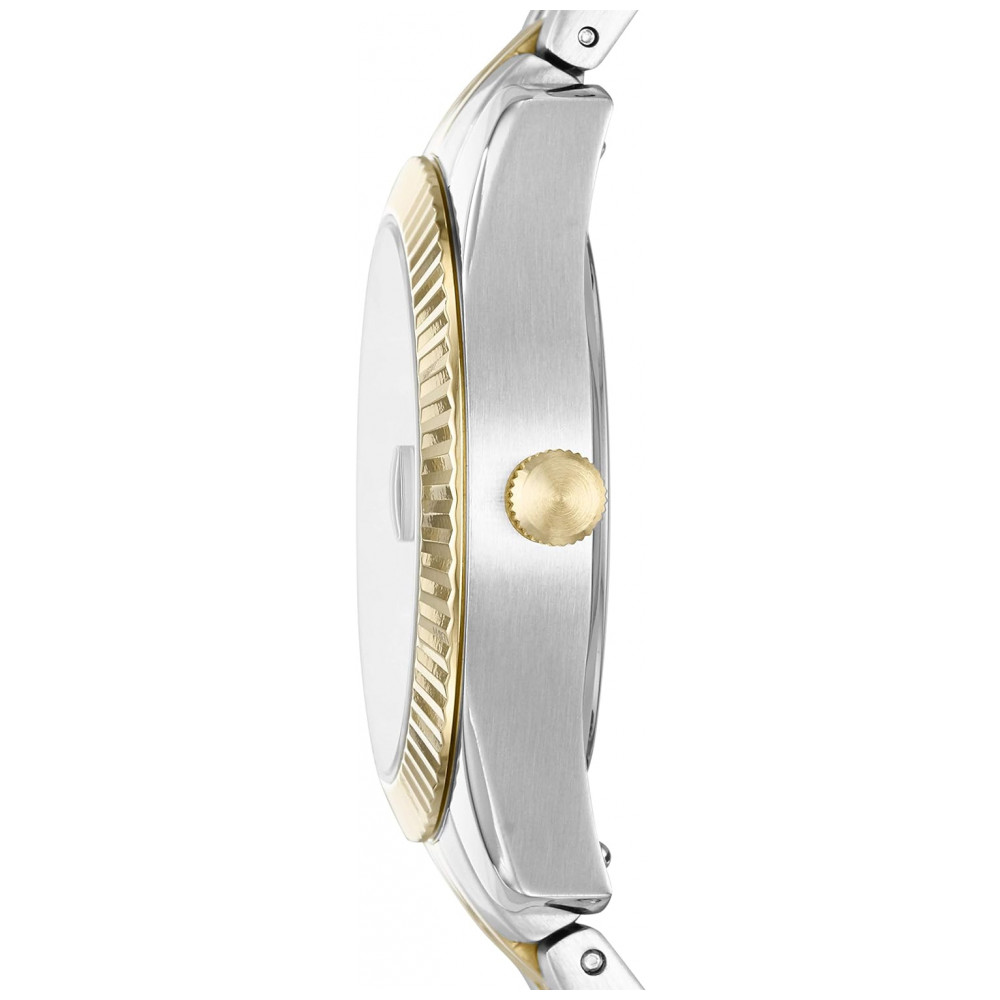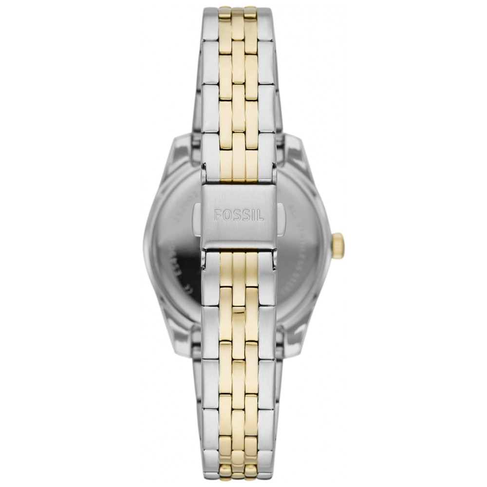 Tamanho da caixa Tamanho da banda movimento de quartzo com visor analógico de três ponteiros e janela de data lente de cristal mineral endurecido resiste a arranhões importado Caixa de aço inoxidável de dois tons com mostrador dourado pulseira de pulseira de aço inoxidável prata e ouro com fecho de fecho dobrável de 2 botões Resistente à água até 50 m 165 pés adequado para curtos períodos de natação recreativa e ducha, mas não para mergulho ou snorkel Personalize o seu relógio com gravações gratuitas em uma loja Fossil local.