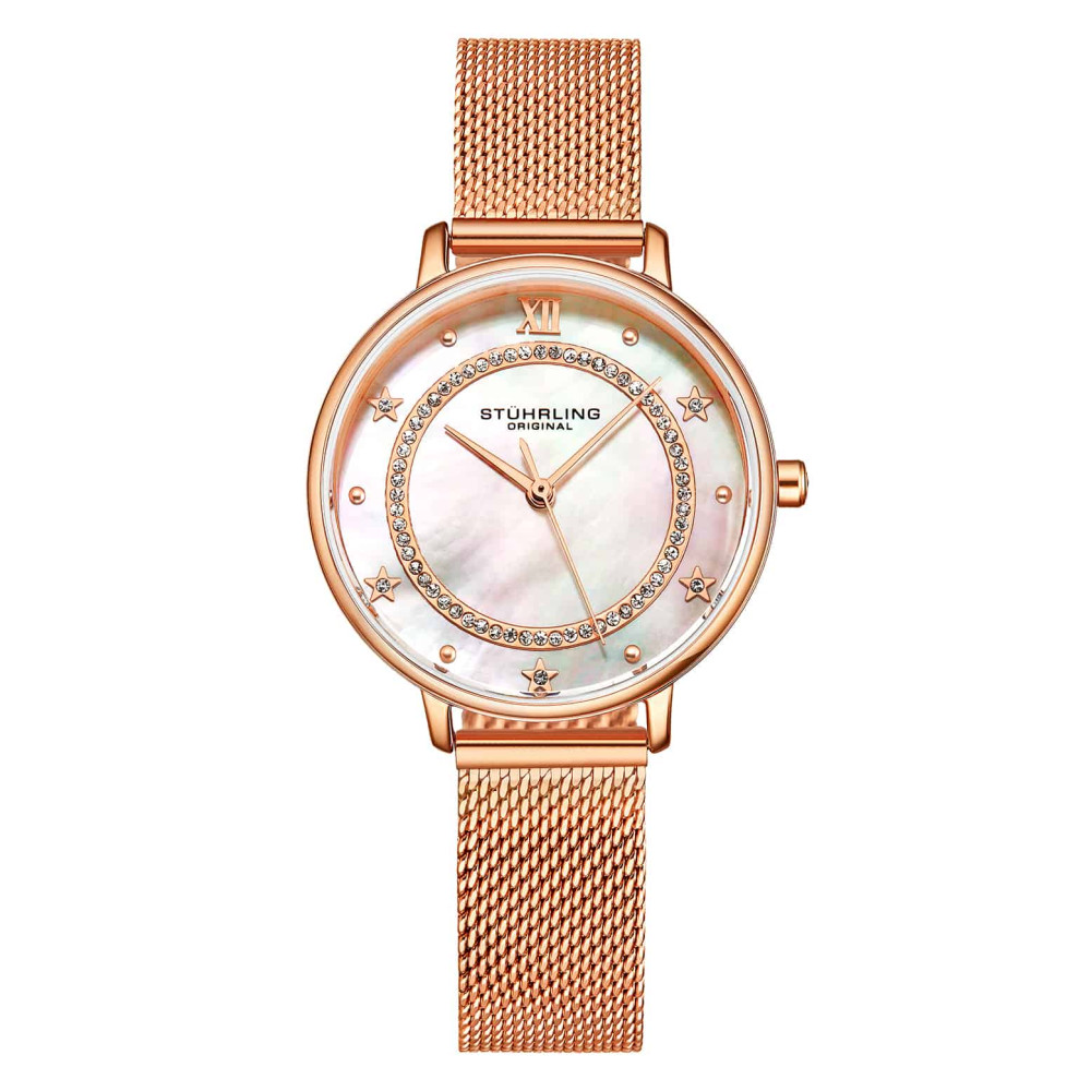 Relógio Feminino Stuhrling Symphony 3993 Quartzo 34mm, Ouro Rosa: Caixa feminina em quartzo rosa, dourado, bisel rosa, dourado, mostrador MOP prateado com anel cravejado de cristal rosa, dourado, ponteiros rosa, ouro, estrela e círculo em cristal rosa, dourado, relógio com pulseira em malha rosa, dourada