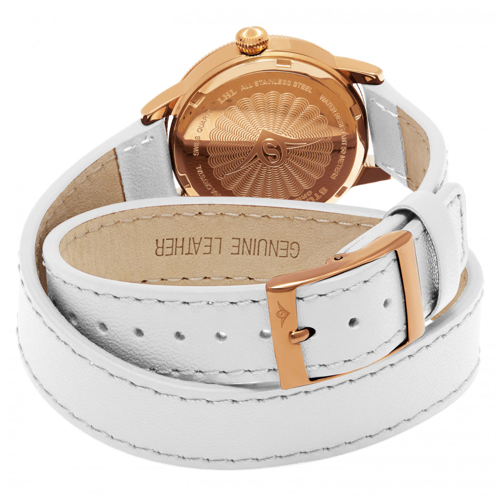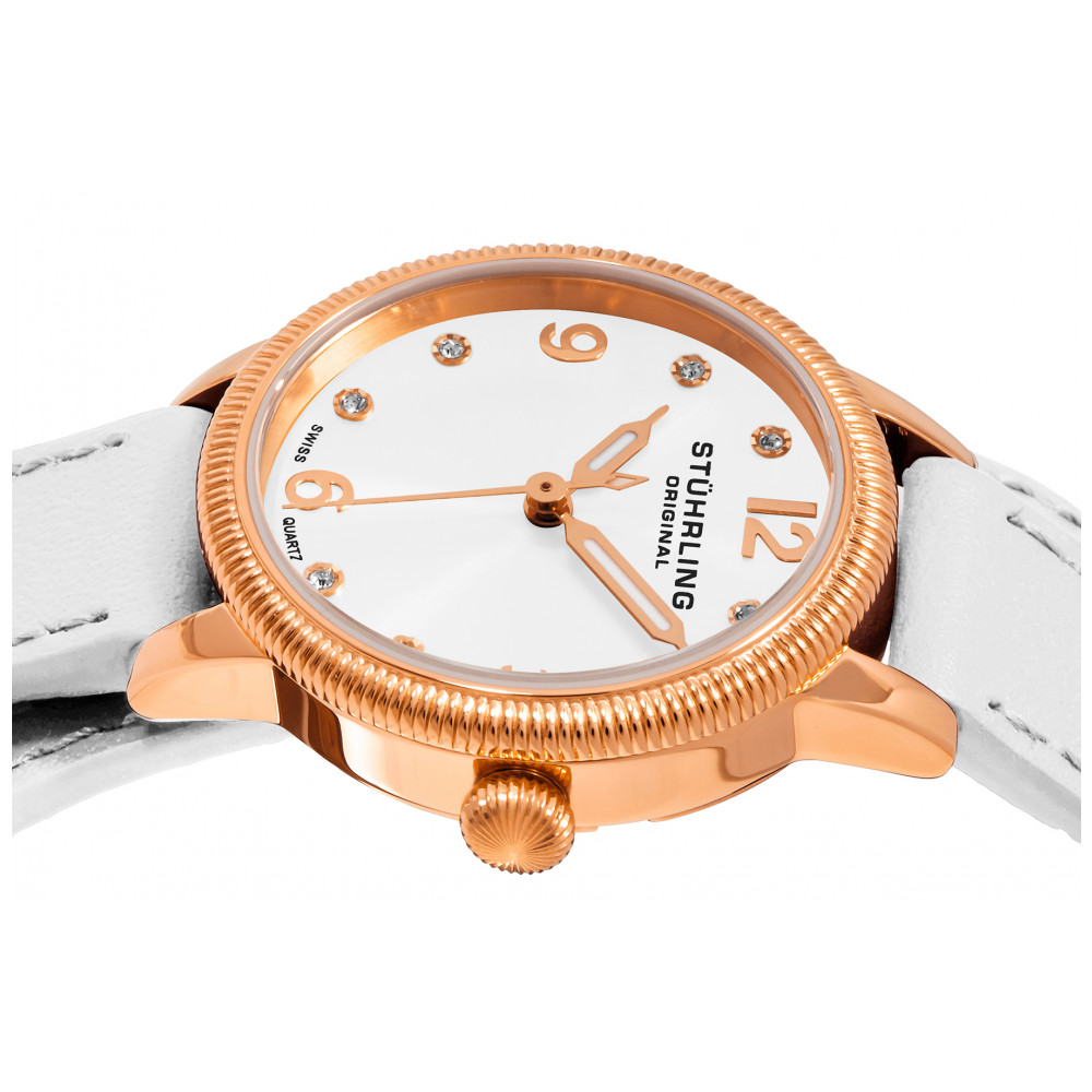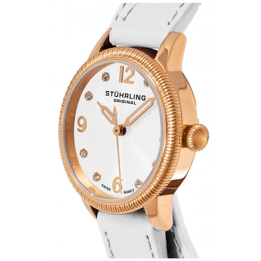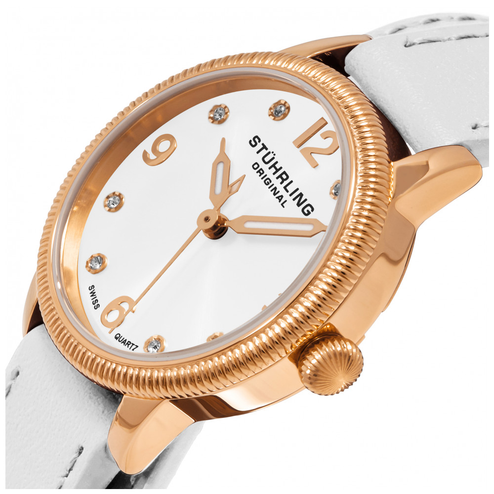 Relógio Feminino Stuhrling Vogue 646 Quartzo 31mm, Branco Clássico: Tamanho da Caixa 31mm Resistente à água 5 ATM 50 metros, 165 pés Moldura de aço inoxidável serrilhada Pulseira de couro com acabamento fosco de largura