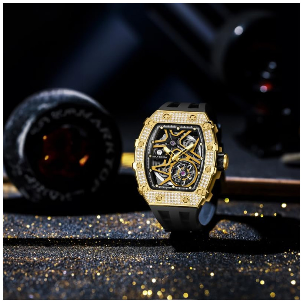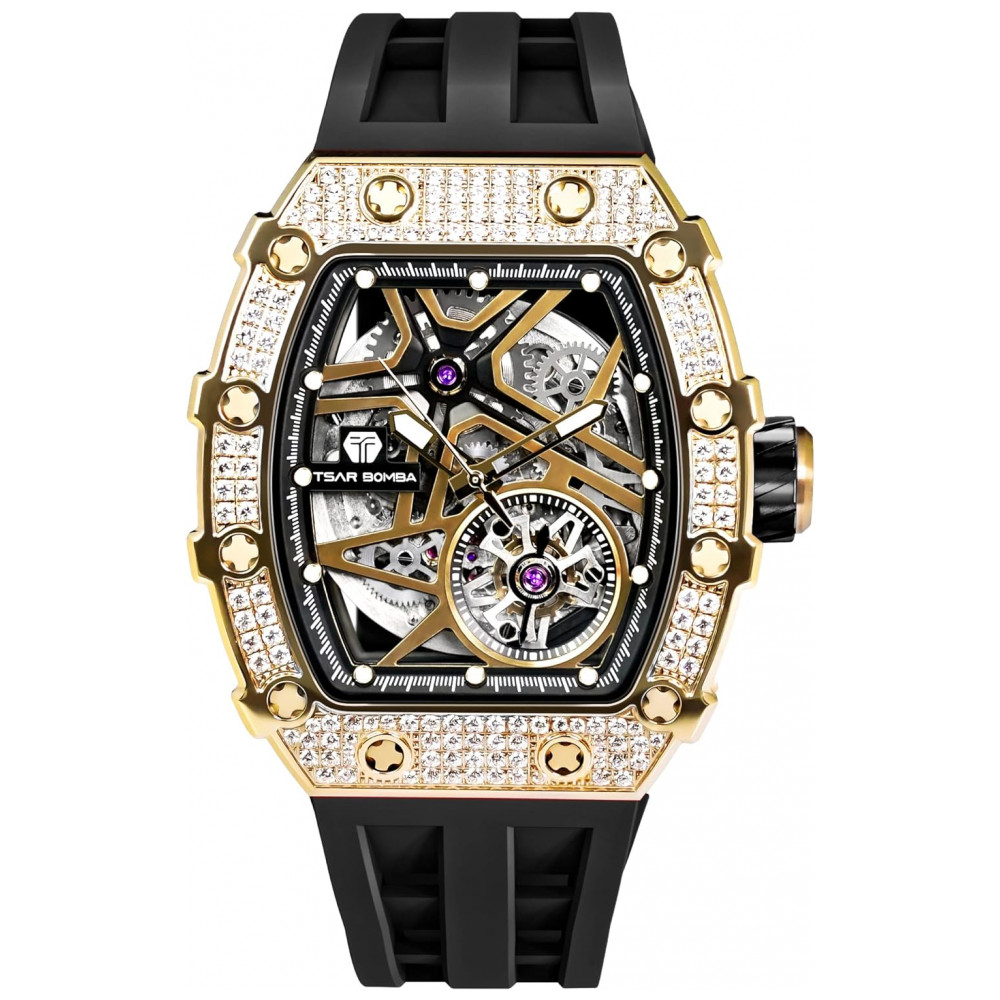 Relógio Masculino Analógico Automático a Prova dÁgua 50M com Pulseira de Silicone, TSAR BOMBA SGLZTB8209 D, Preto: relógio CZ de zircônia cúbica genuína e puro brilho Os diamantes simulados mais brilhantes do mundo.