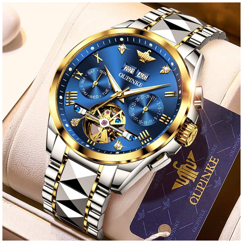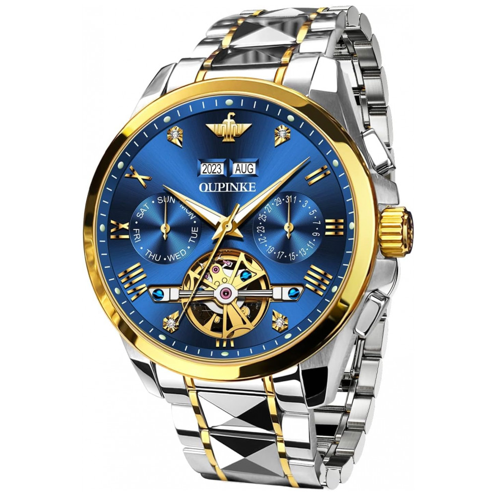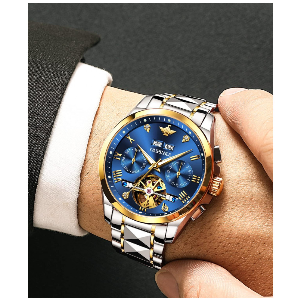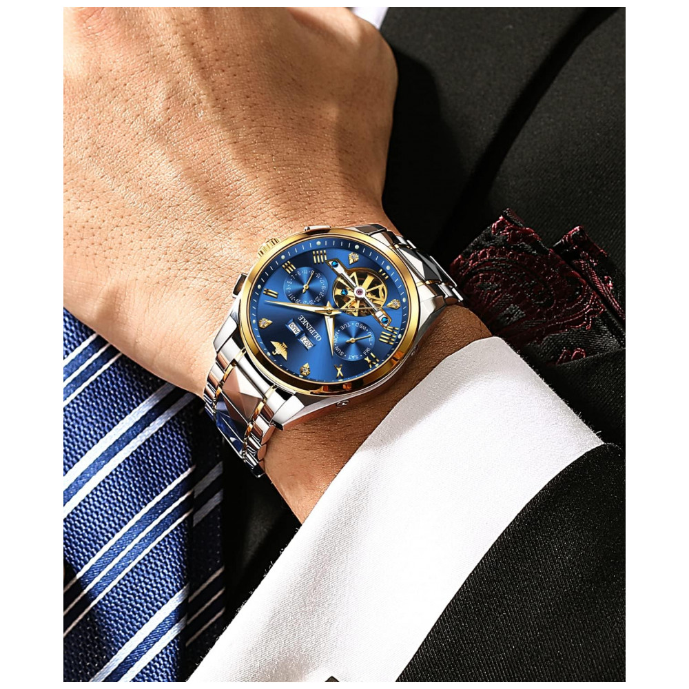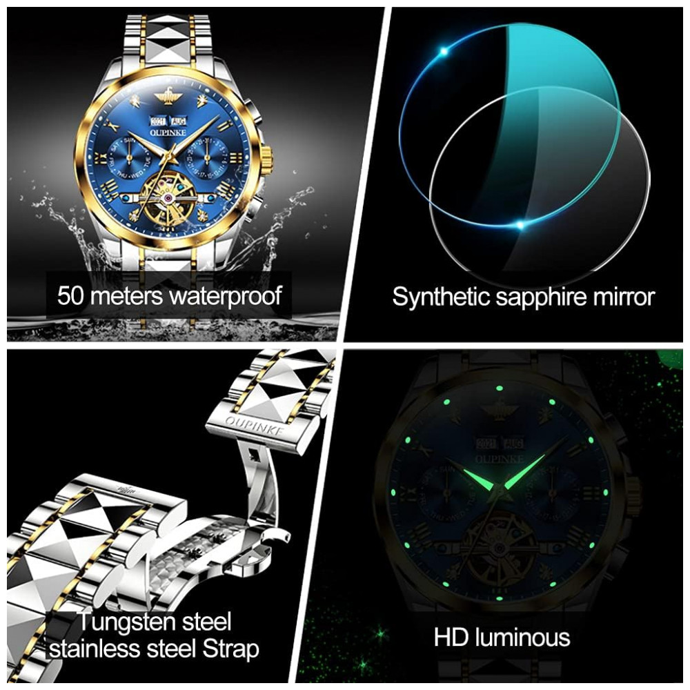 Relógio de pulso multifuncional requintado Relógio mecânico com calendário anual, calendário mensal, dia da semana, calendário, exibição de 24 horas e ponteiros luminosos e à prova dágua 50m 160 pés, geralmente pode suportar alta pressão e à prova dágua para lavagem das mãos, banho frio , e lavagem de carros.