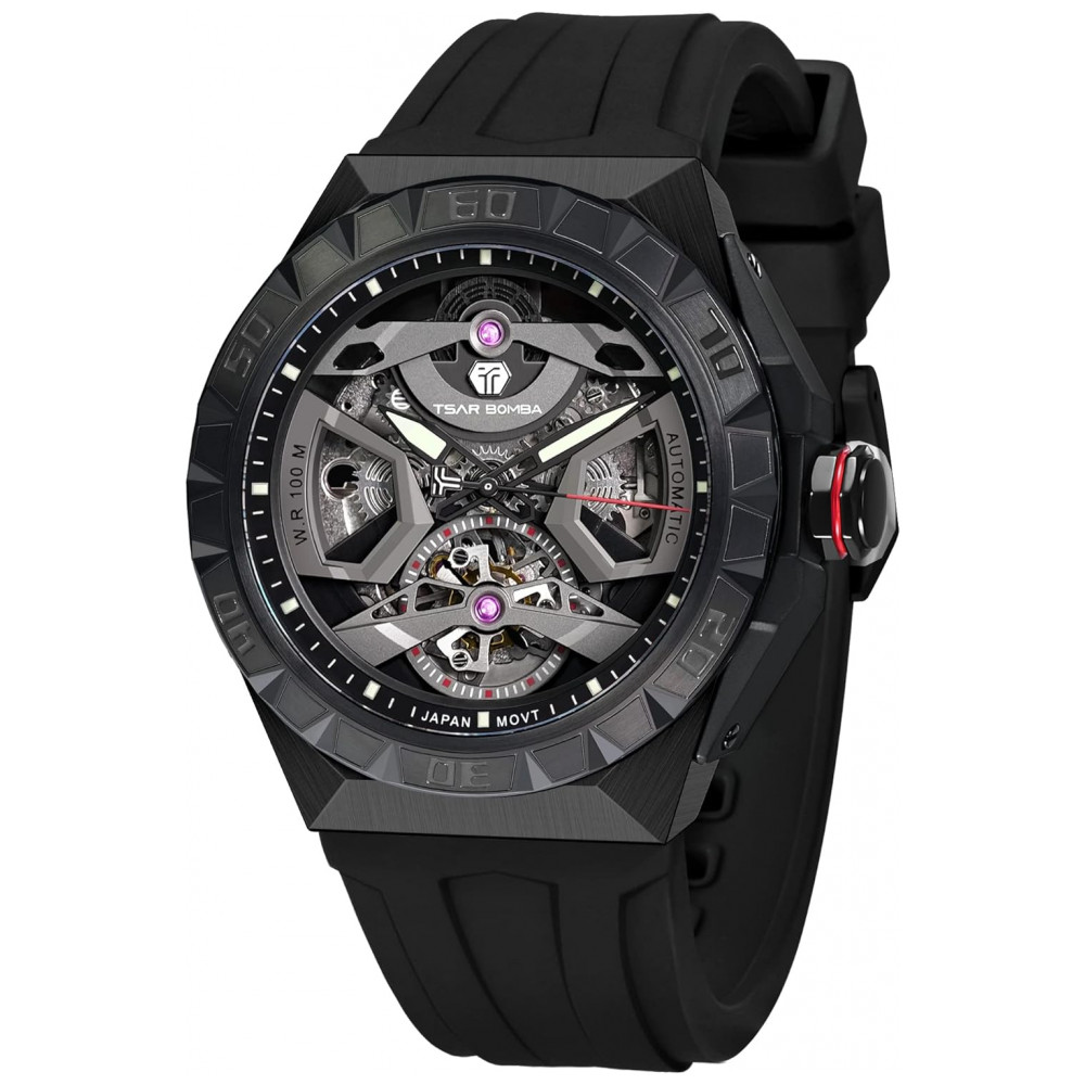 Relógio Masculino Analógico Automático Mecânico a Prova dÁgua 100M com Pulseira de Silicone, TSAR BOMBA 8804, Preto