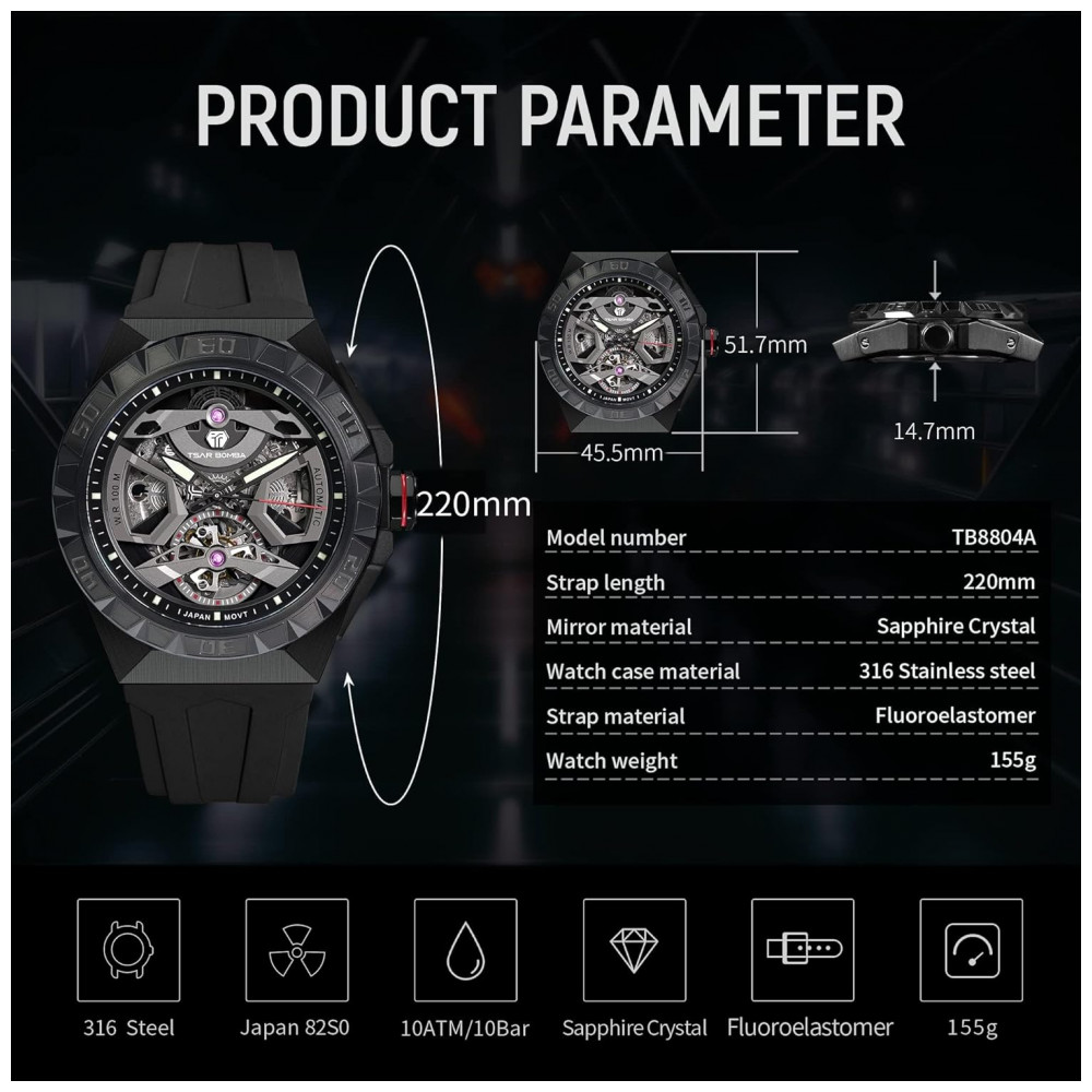 As informações do relógio são as seguintes Marca TSAR BOMBA Modelo 8804 Número da peça TB2022 8804 Ano do modelo 2022 Forma Octogonal Cristal Cristal de safira Tipo de tela ou mostrador Simulação Fecho Fivela Material da caixa Aço inoxidável Diâmetro da caixa 5 centímetros Espessura da caixa 15 milímetros Material da faixa, pulseira ou tira Borracha de flúor Tamanho da banda Padrão masculino Largura da faixa, pulseira ou tira 22 milímetros Cor da faixa, pulseira ou tira Preto Cor do mostrador Preto Tipo de material do bisel Aço inoxidável Função do bisel Exibição de 12 horas Características especiais Segundo ponteiro, Resistente a choques, Luminoso Movimento do relógio Automático Japonês Resistência à água 100 metros