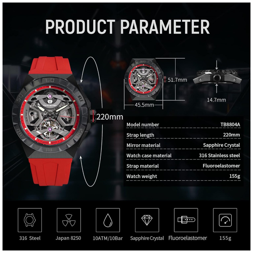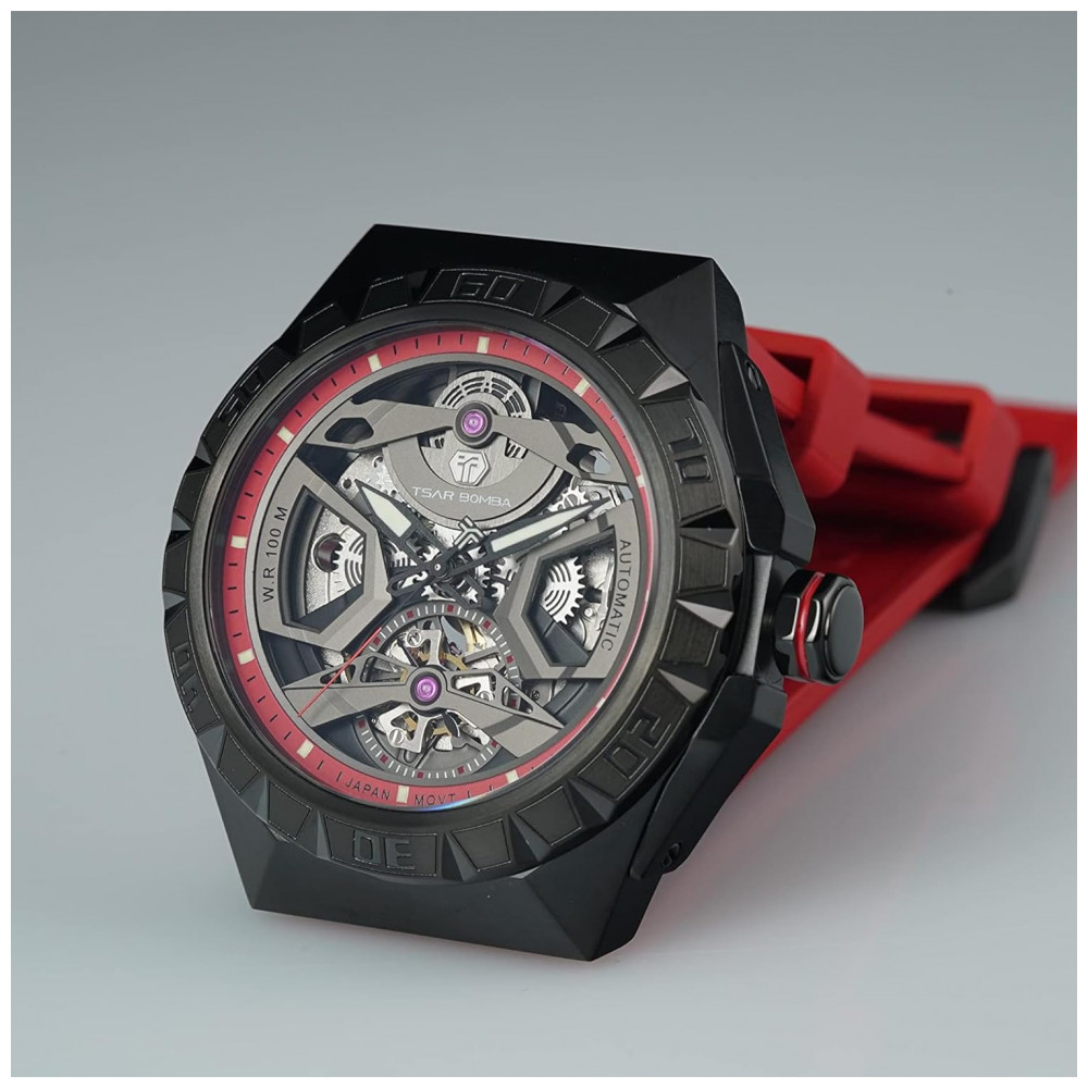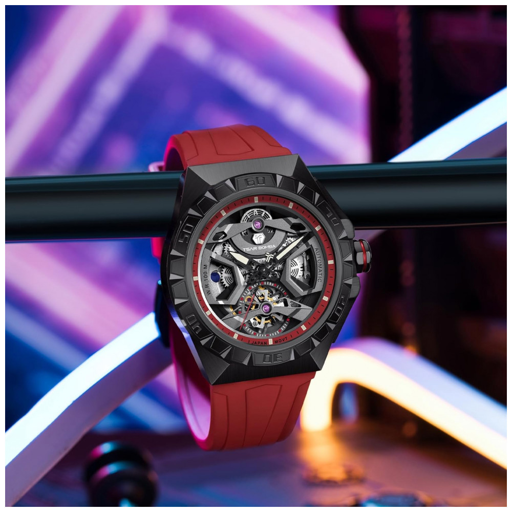Relógio Masculino Analógico Automático Mecânico a Prova dÁgua 100M com Pulseira de Silicone, TSAR BOMBA SGLZTB8804 FR, Vermelho: Guerreiro de guarda de tempo TSAR BOMBA Design exclusivo de moldura O com as marcas de tick SIX azimuth podem acompanhar a data.