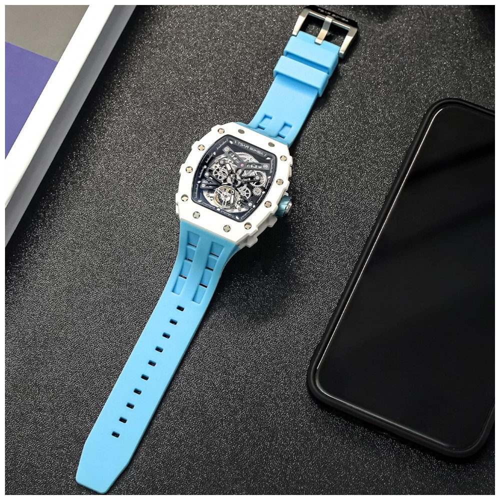 Relógio Masculino Analógico Automático Mecânico a Prova dÁgua 50M com Pulseira de Silicone, TSAR BOMBA SGLZ TB 8208, Azul