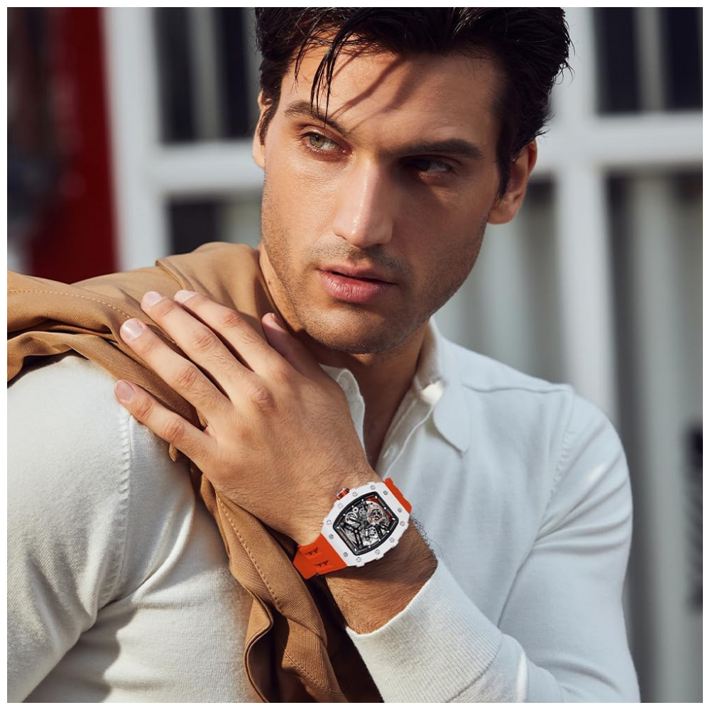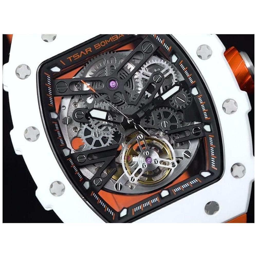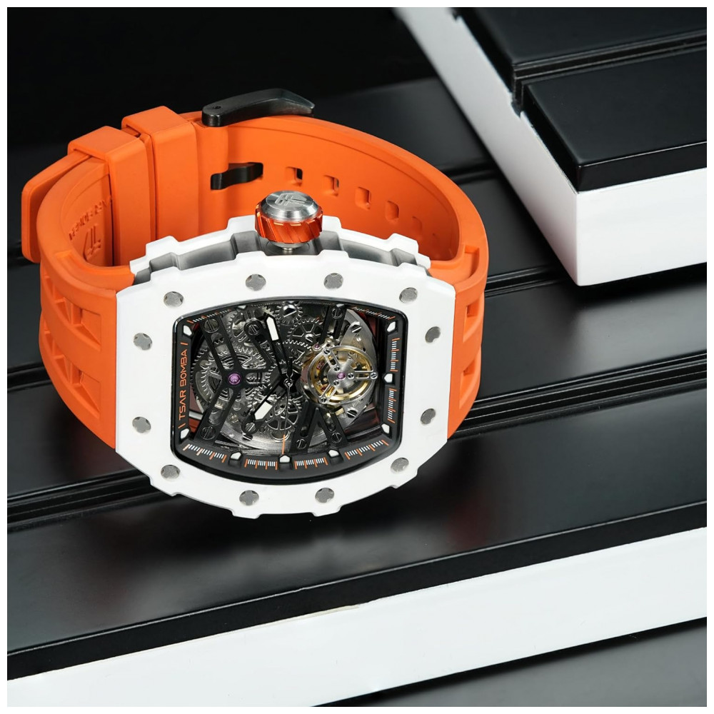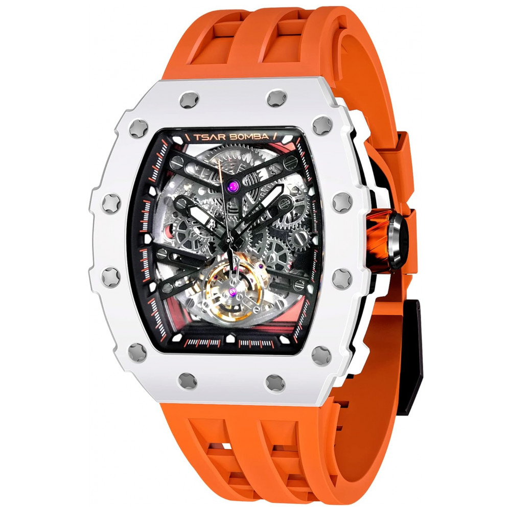Relógio Masculino Analógico Automático Mecânico a Prova dÁgua 50M com Pulseira de Silicone, TSAR BOMBA SGLZ TB 8208, Laranja e Prata: Modelo cerâmico uma interpretação diferente da TSAR BOMBA Superfície inovadora de revestimento cerâmico para serviços pesados, parafusos e ranhuras padronizados são chanfrados e retificados, a ponta é arredondada e polida, tratamento de superfície micro jateado , tratamento de superfície fosco , tratamento de chanfro geado.