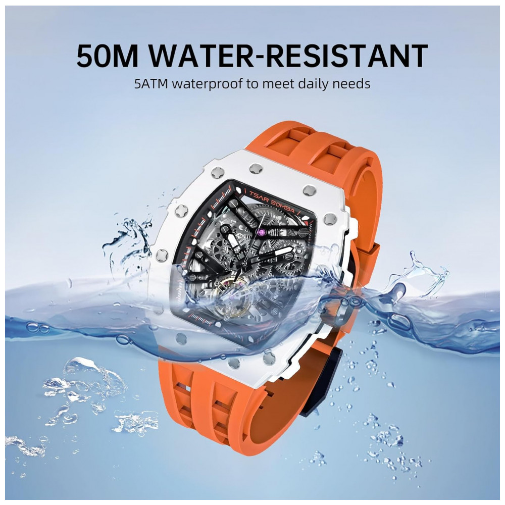Relógio Masculino Analógico Automático Mecânico a Prova dÁgua 50M com Pulseira de Silicone, TSAR BOMBA SGLZ TB 8208, Laranja e Prata