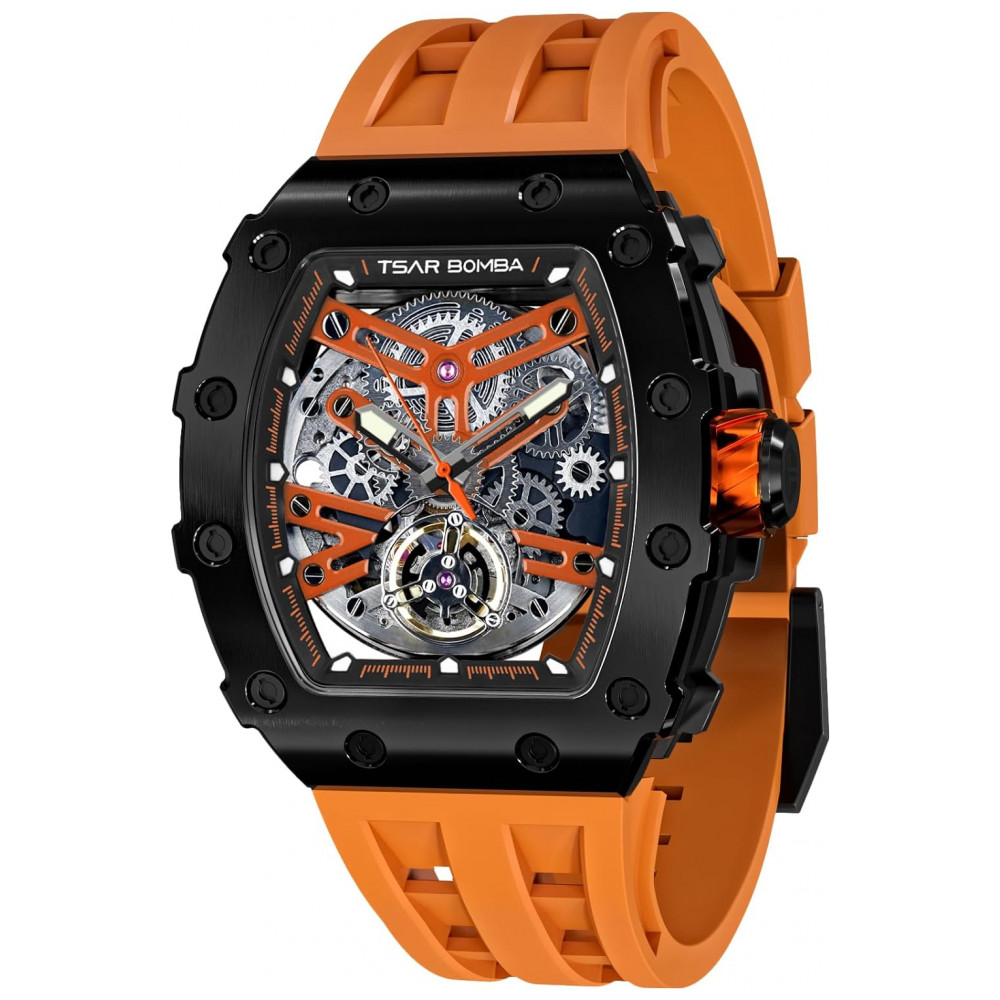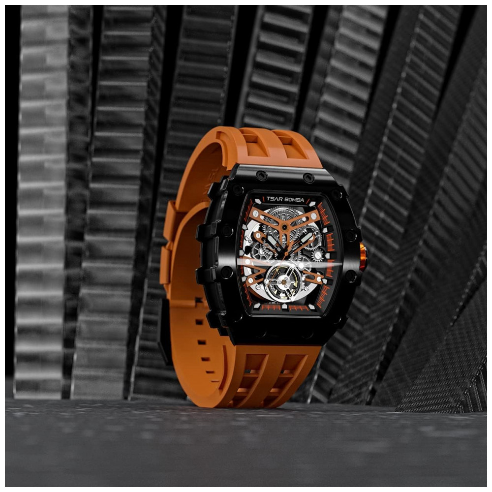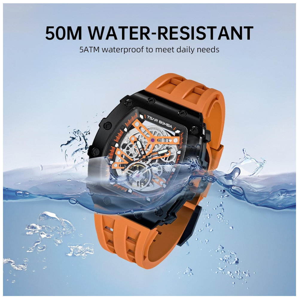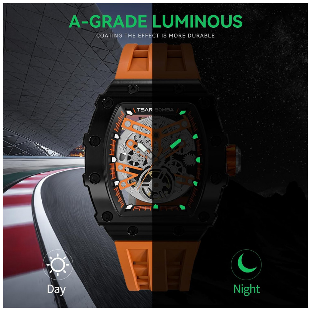 Relógio Masculino Analógico Automático Mecânico a Prova dÁgua 50M com Pulseira de Silicone, TSAR BOMBA TB8208SGLZ, Laranja: Relógios automáticos para homens Nascido no laboratório de força sino alemão.