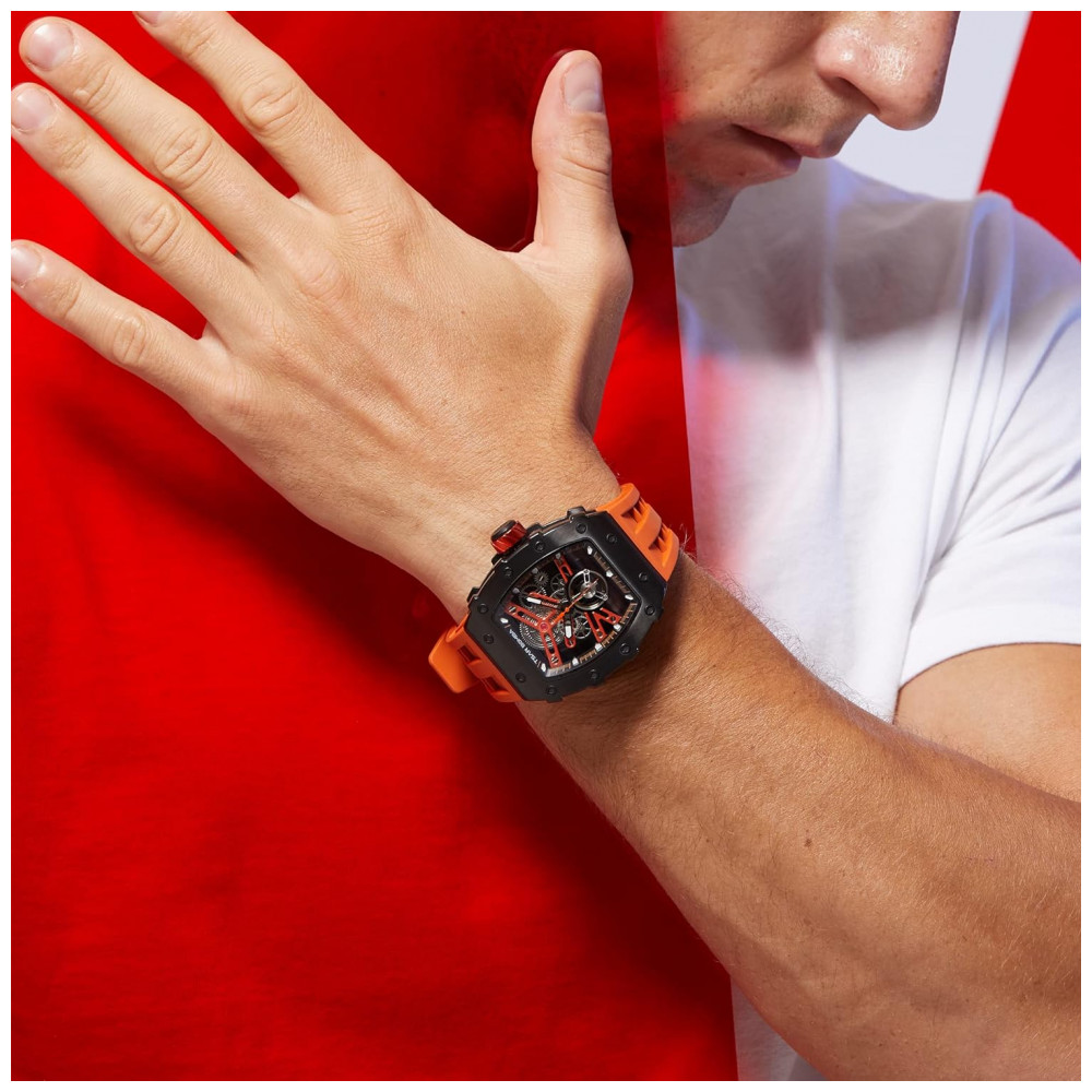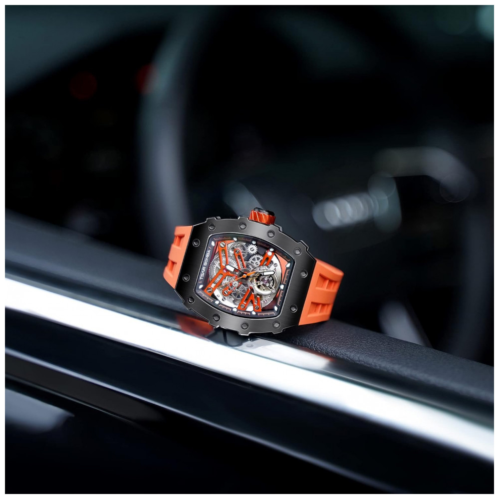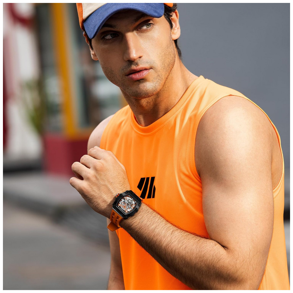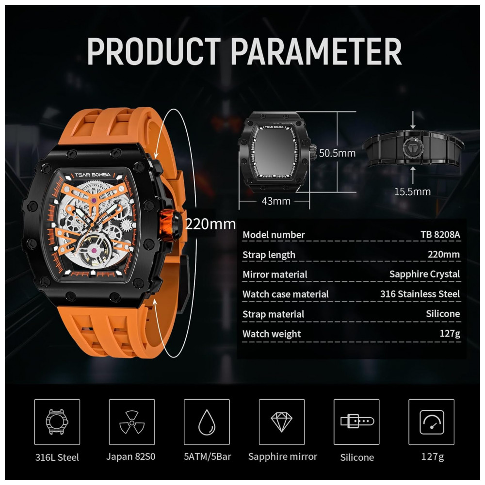 Relógio Masculino Analógico Automático Mecânico a Prova dÁgua 50M com Pulseira de Silicone, TSAR BOMBA TB8208SGLZ, Laranja: Relógios automáticos para homens Nascido no laboratório de força sino alemão.