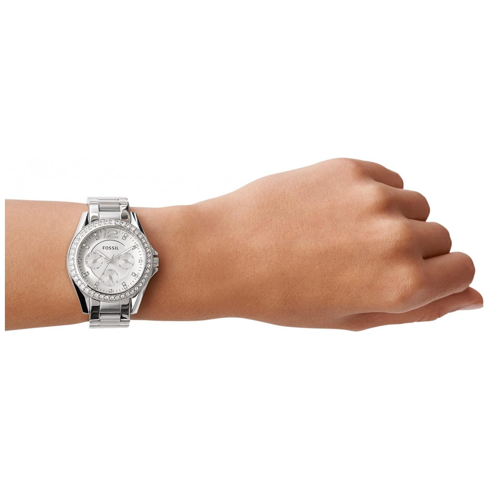 Tamanho da caixa 38mm Tamanho da faixa 18mm movimento de quartzo com display multifuncional lente de cristal mineral endurecido resiste a arranhões importado Caixa de aço inoxidável com mostrador prateado pulseira de aço inoxidável com fecho de encaixe de pressão única Resistente à água até 100 m 330 pés adequado para banho, natação ou mergulho com snorkel, mas não é resistente o suficiente para suportar mergulho Personalize seu relógio com gravação gratuita em uma loja Fossil local.