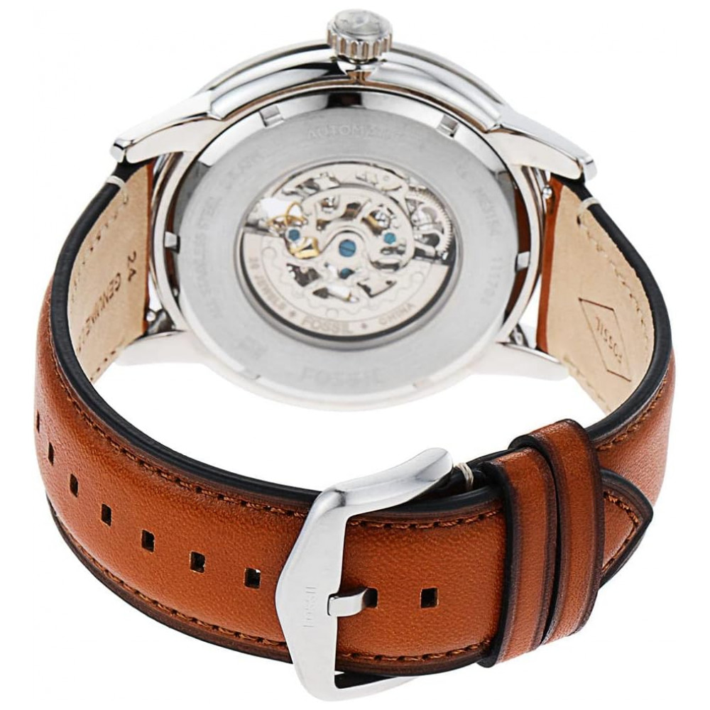 Tamanho da caixa Tamanho da banda movimento mecânico automático com display analógico lente de cristal mineral endurecido resiste a arranhões importado Caixa de aço inoxidável com mostrador azul pulseira de couro marrom para bagagem com fecho de fivela intercambiável com todas as pulseiras de relógio fóssil de Resistente à água até 50 m 165 pés adequado para curtos períodos de natação recreativa e ducha, mas não para mergulho ou snorkel