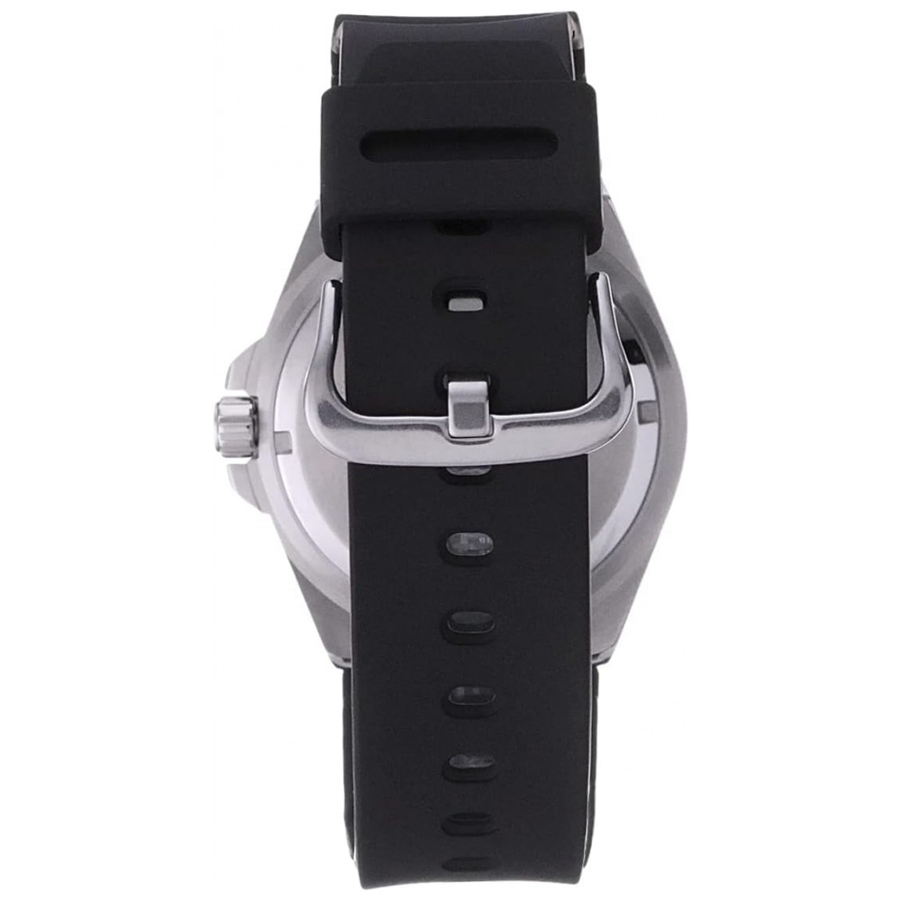 A pulseira de resina preta do relógio e a caixa de aço inoxidável conferem lhe um aspecto clássico enquanto a sua a moldura anti reversa adiciona um visual inspirado pelo mergulhador.