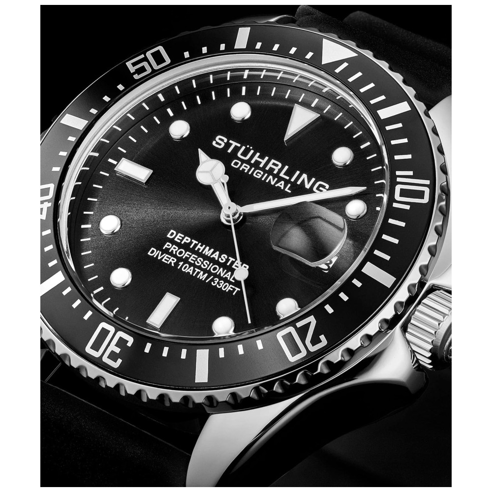 Relógio Masculino Pro Diver Watch, Quartzo, Prova D 100m, STUHRLING 3950R.1, Preto: FÁCIL DE LER ponteiros e índices luminescentes, coletados em um bisel de ponta de moeda e finalizados com uma coroa aparafusada assinada.