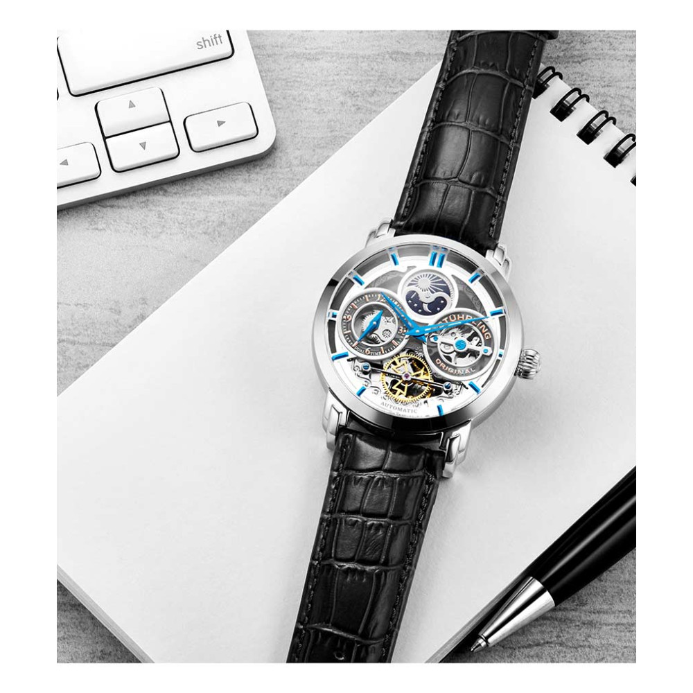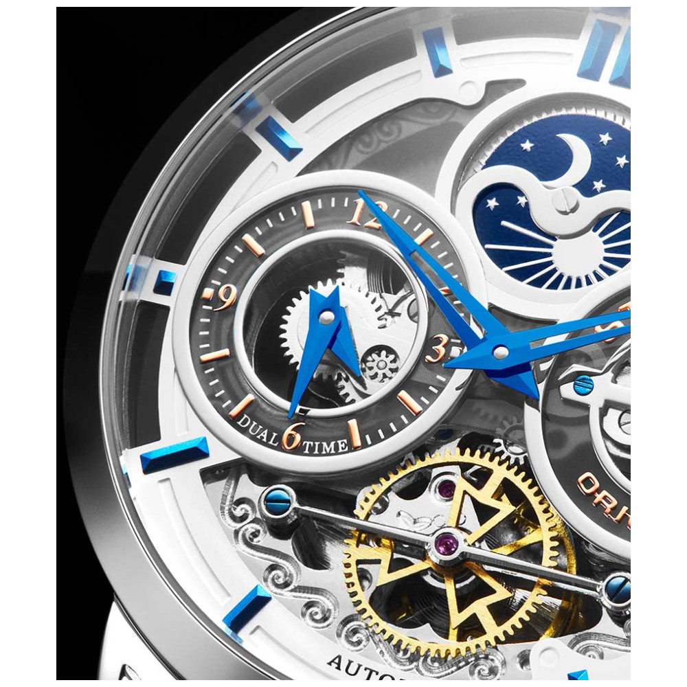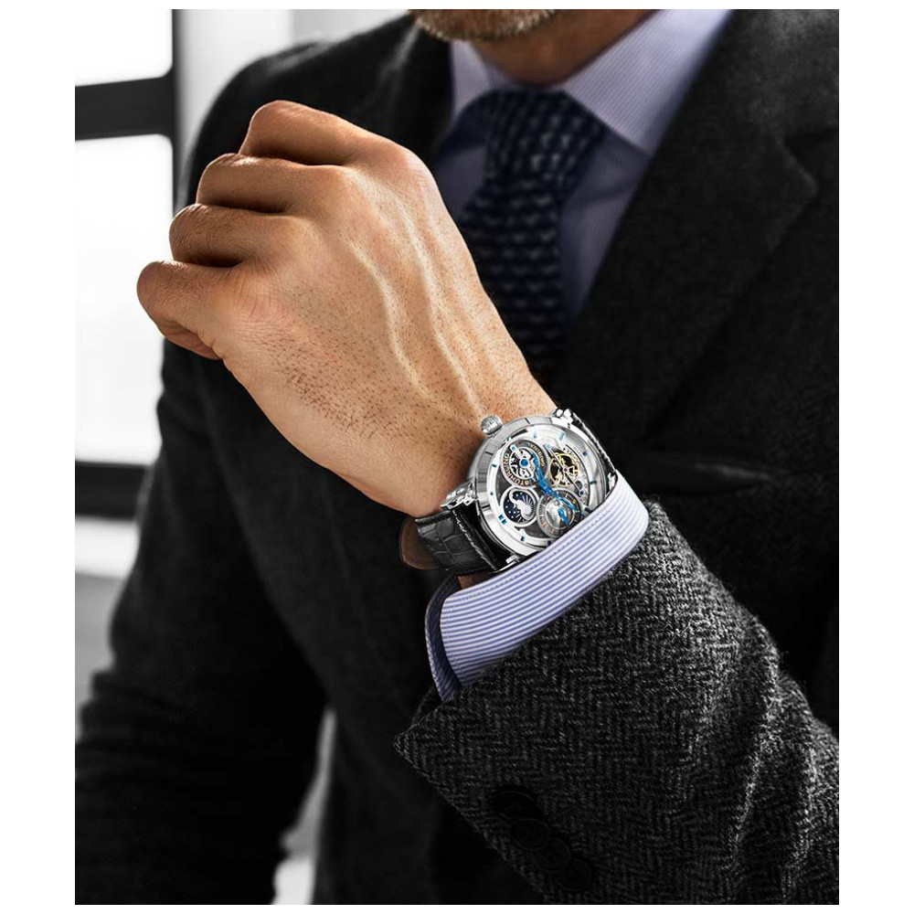 Apresentando um segundo fuso horário às 9 horas e um subdial AM, PM animado às 12 horas, o Luciano é de tirar o fôlego tanto em sua funcionalidade quanto em seu design.