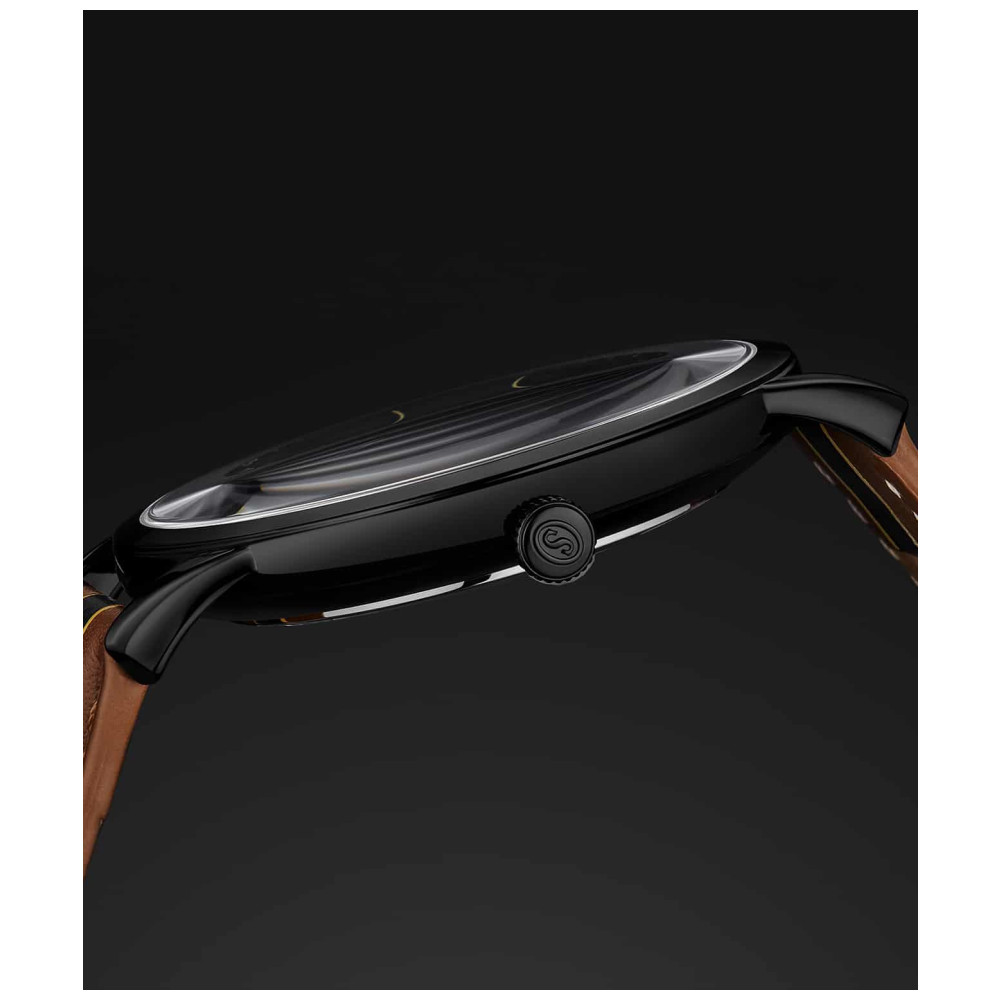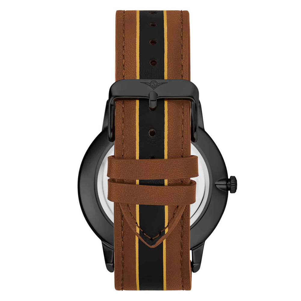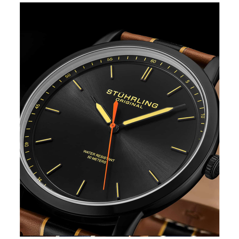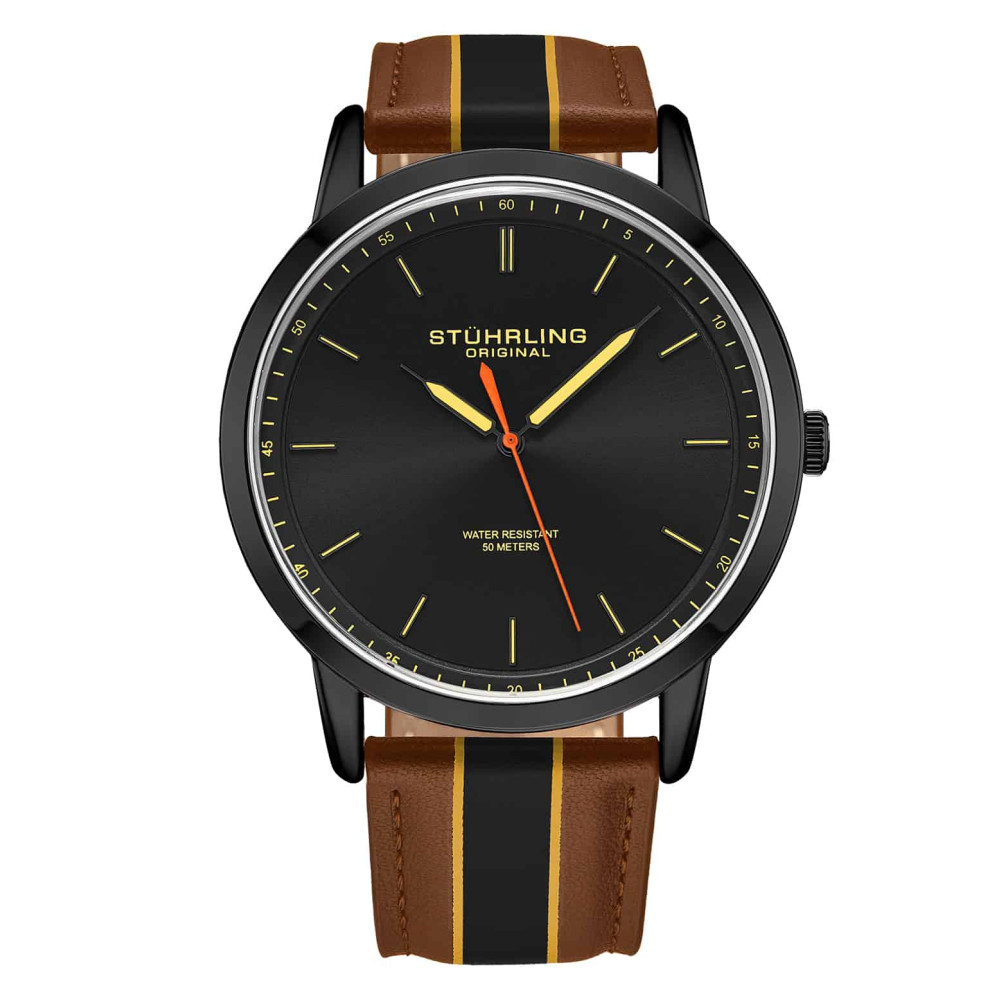 Relógio Masculino Stuhrling 3992 Quartzo 44mm, Marrom e Preto: Tamanho da Caixa 44mm Resistente à água 5 ATM 50 metros, 165 pés Moldura Polida Fixa Pulseira de couro de largura