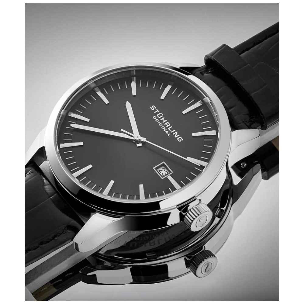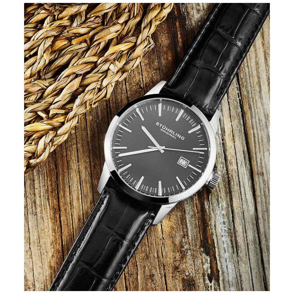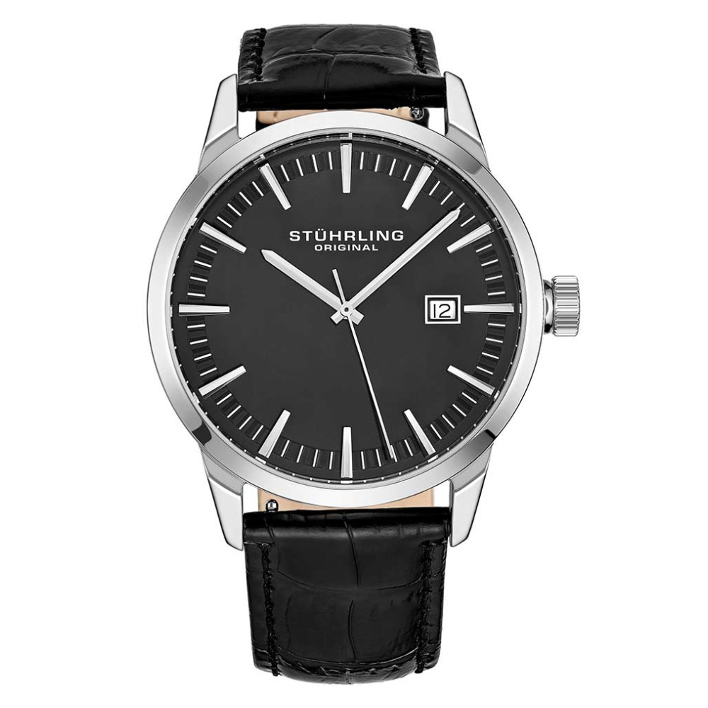 Relógio Masculino Stuhrling 555A.02 Quartzo 42mm, Preto: Tamanho da Caixa 42mm Resistente à água 5 ATM 50 metros, 165 pés moldura polida Pulseira de couro em relevo de crocodilo intercambiável de largura