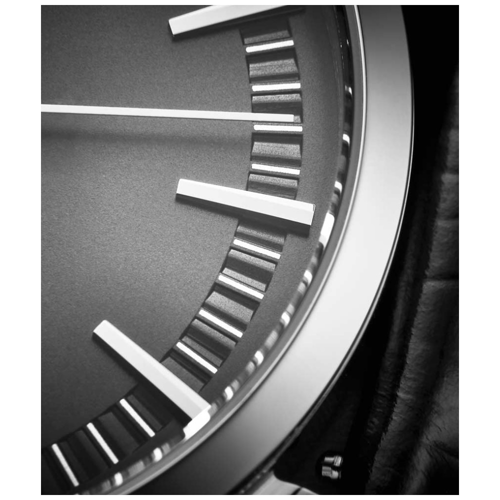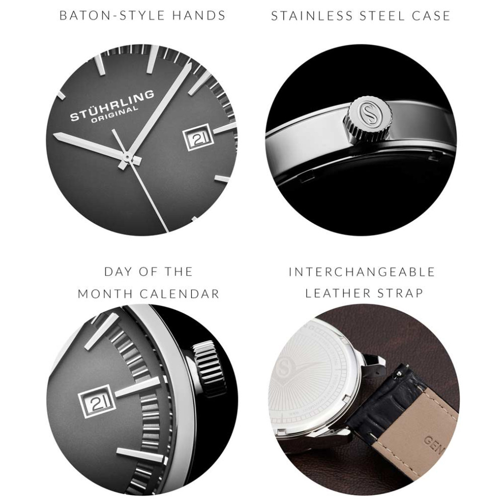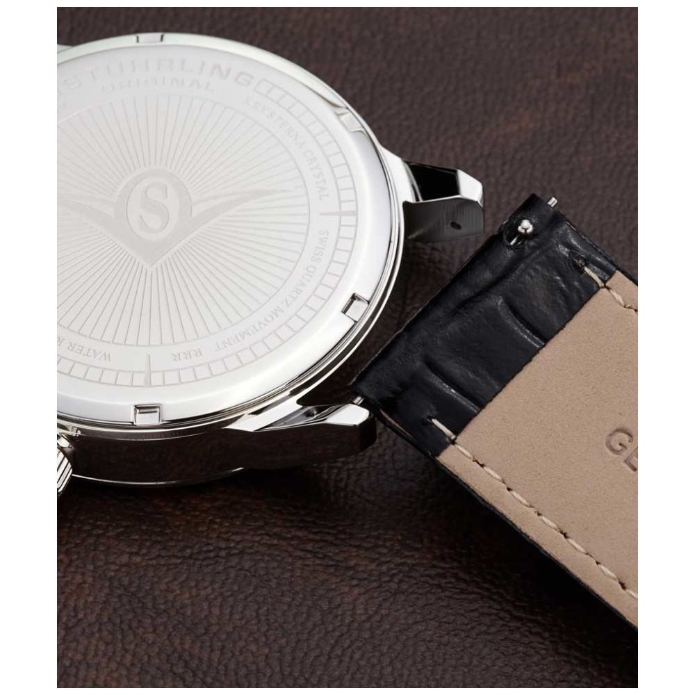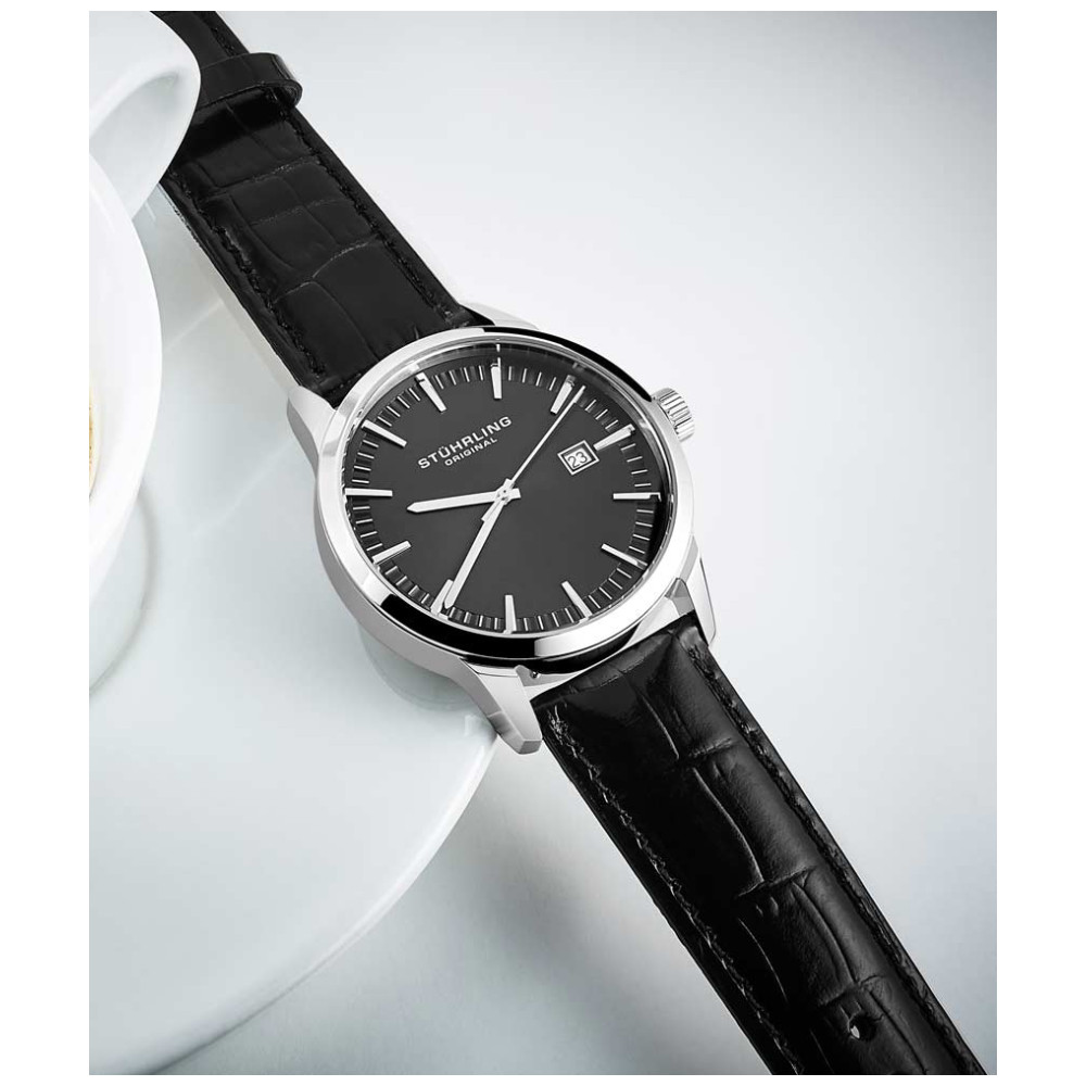 Relógio Masculino Stuhrling 555A.02 Quartzo 42mm, Preto: Tamanho da Caixa 42mm Resistente à água 5 ATM 50 metros, 165 pés moldura polida Pulseira de couro em relevo de crocodilo intercambiável de largura