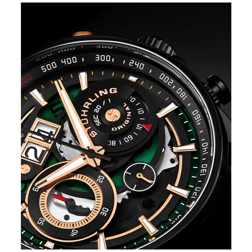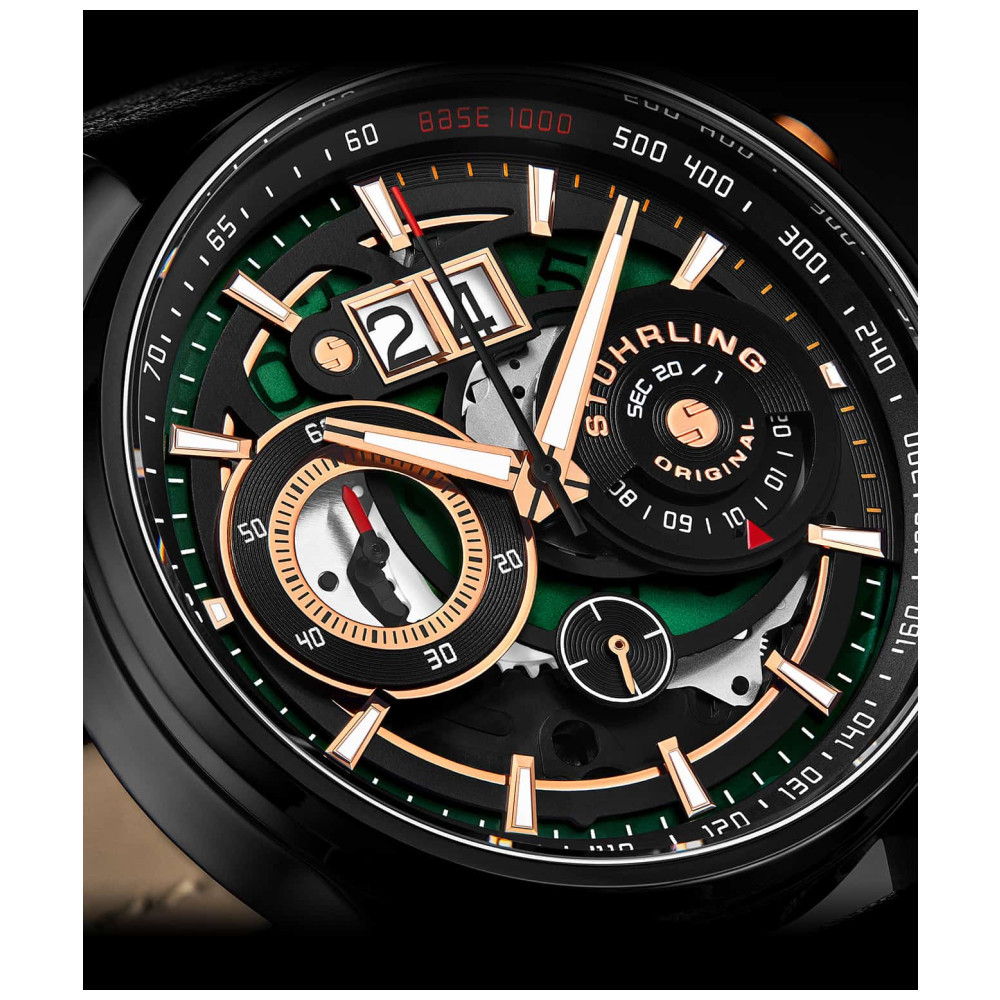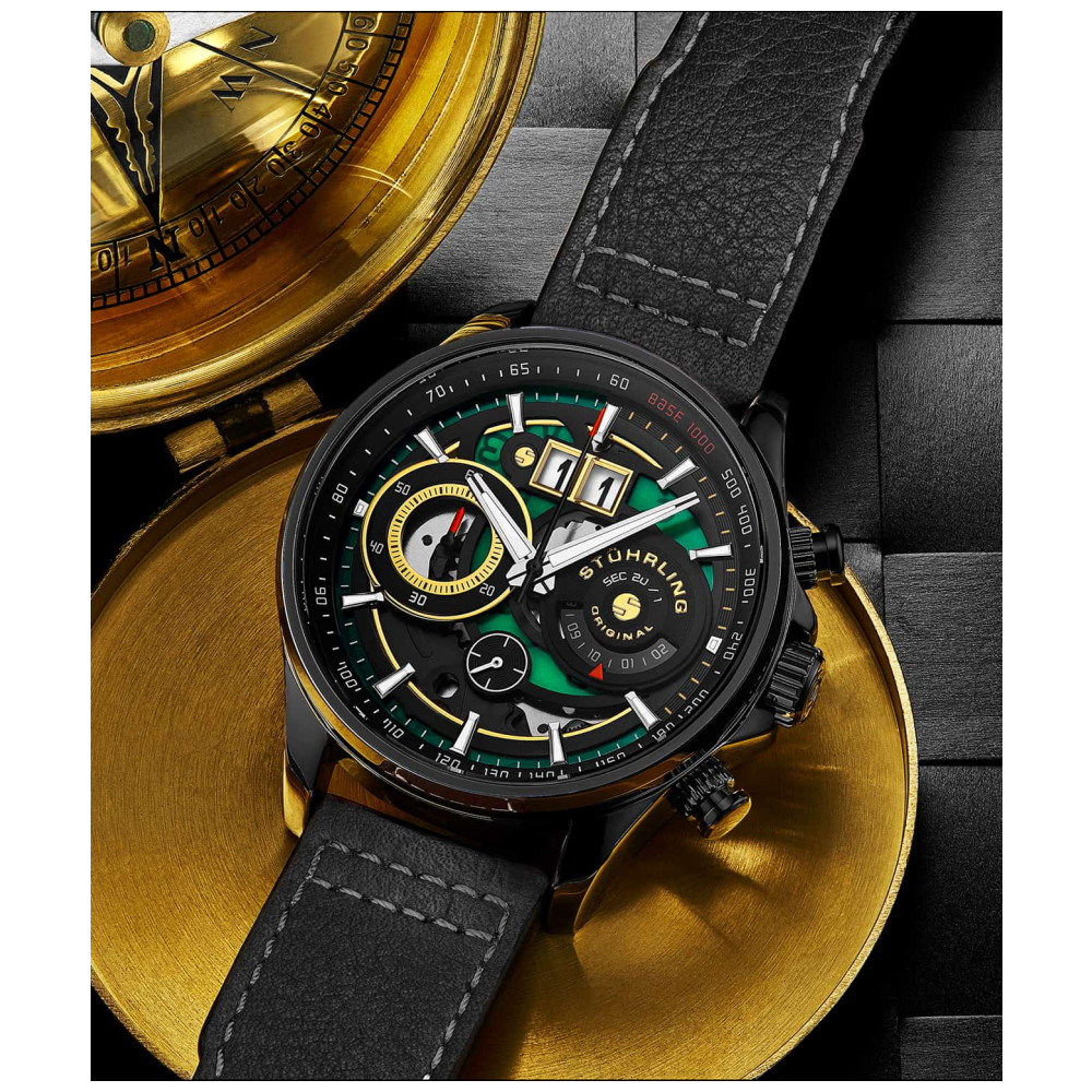 Relógio Masculino Stuhrling 923 Quartzo 45mm com Cronógrafo, Preto: Tomando dicas de design de relógios piloto clássicos, o Ace Aviator 45mm apresenta uma face mecânica detalhada, recursos de cronógrafo, taquímetro e uma pulseira de couro de bezerro premium com costura visível.