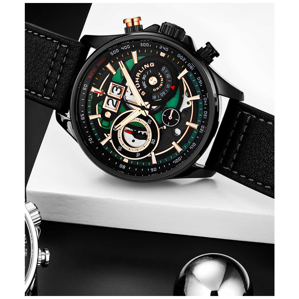 Tamanho da caixa 45mm Apresenta um recurso de cronógrafo e taquímetro para mantê lo atualizado e atualizado com sua vida Verifique rapidamente o dia do mês Índices preenchidos com luminova e um mostrador esqueleto complexo