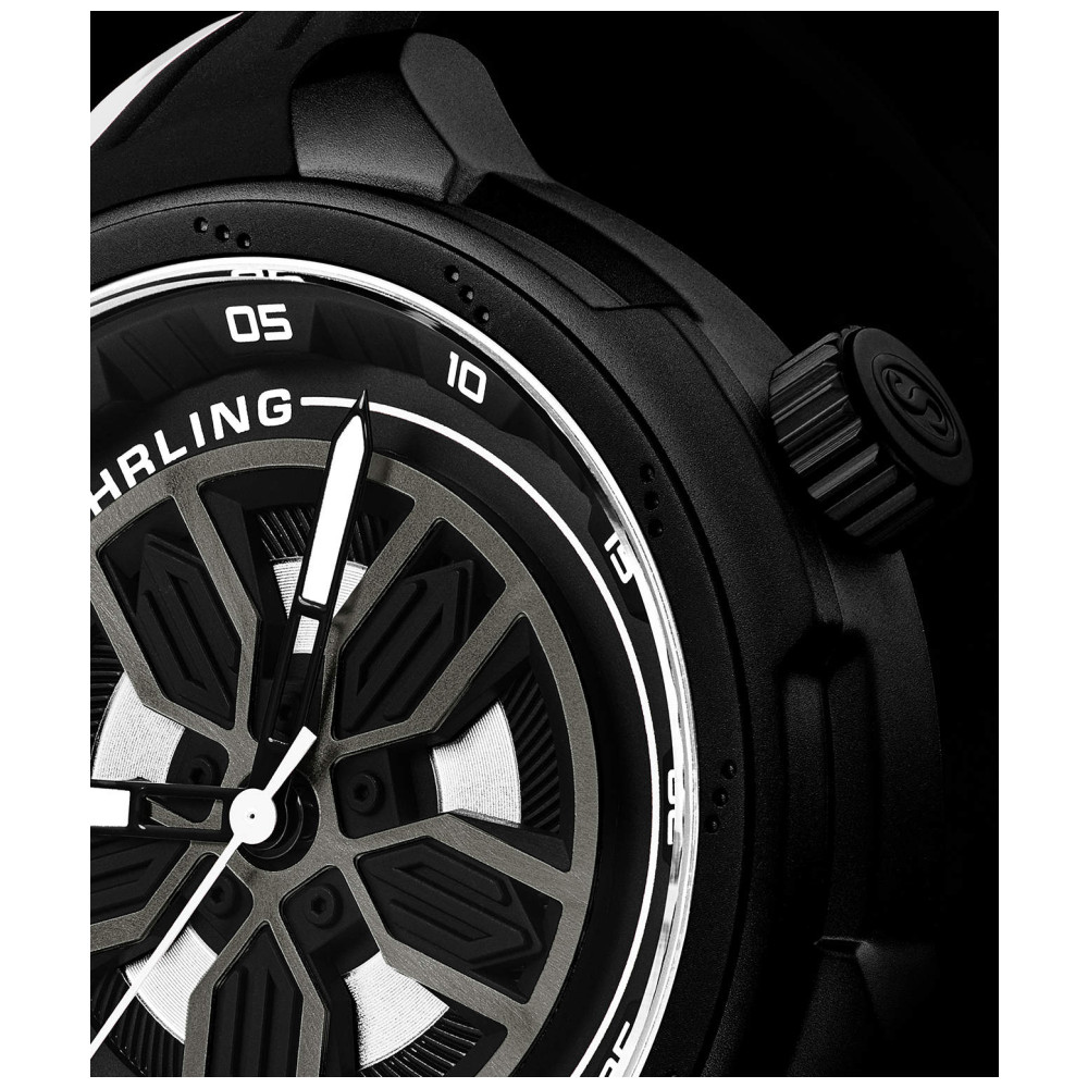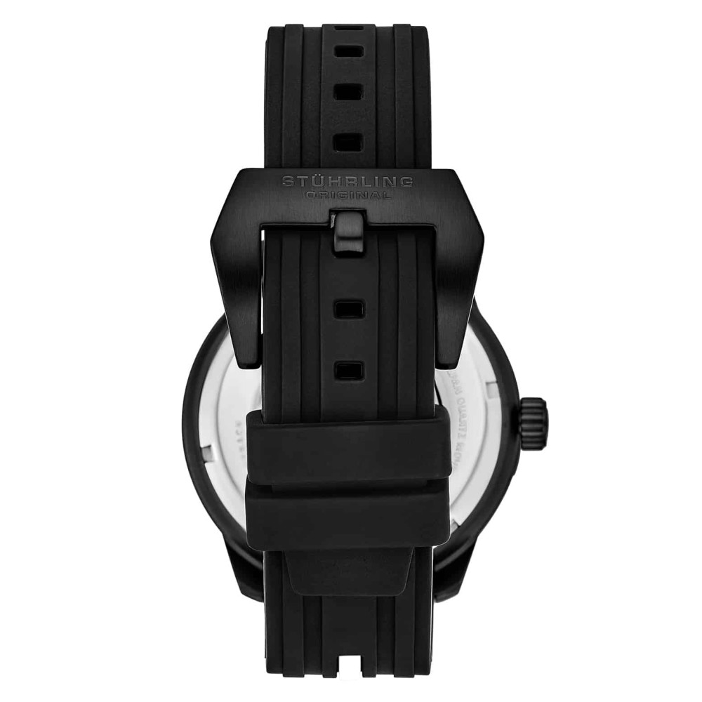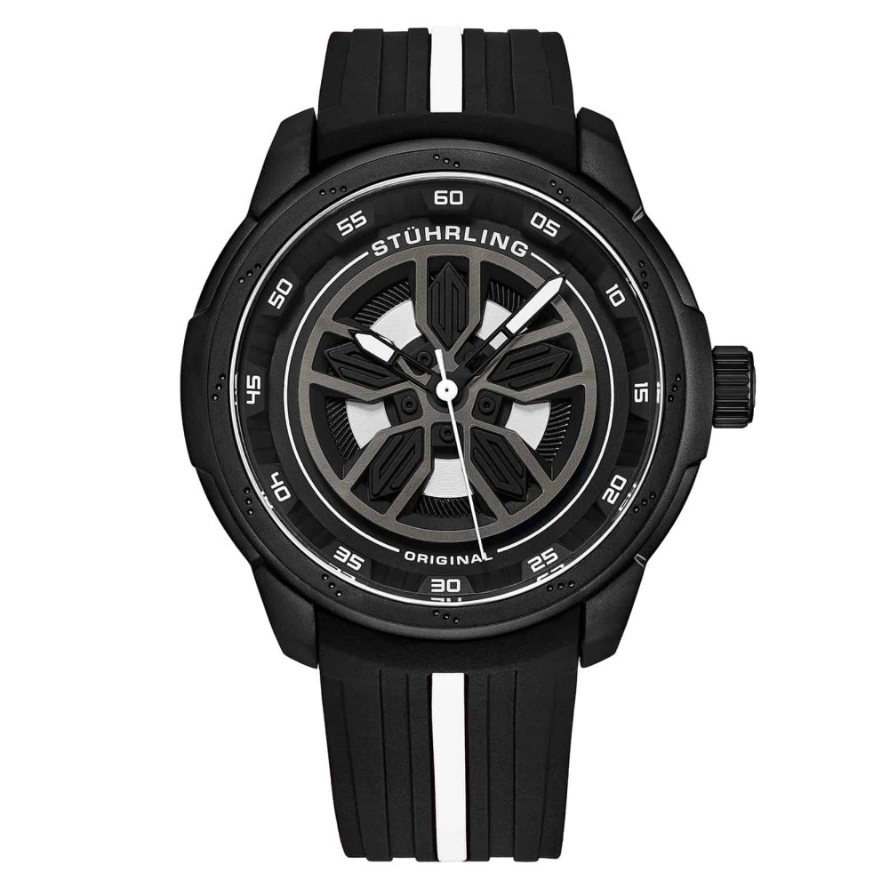 Relógio Masculino Stuhrling 984 Quartzo 44mm, Preto e Branco: Tamanho da Caixa 44mm Resistente à água 3 ATM 30 metros, 100 pés Moldura decorada com rotor de freio fixo Correia de borracha com faixa colorida de largura