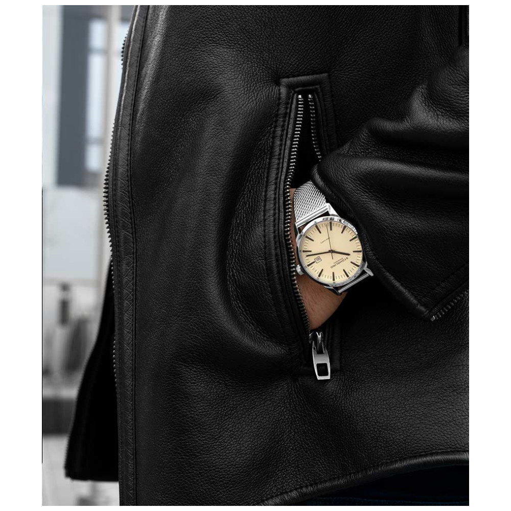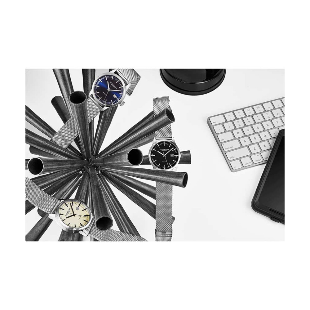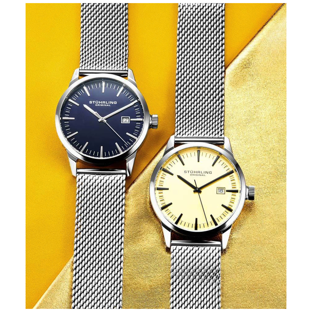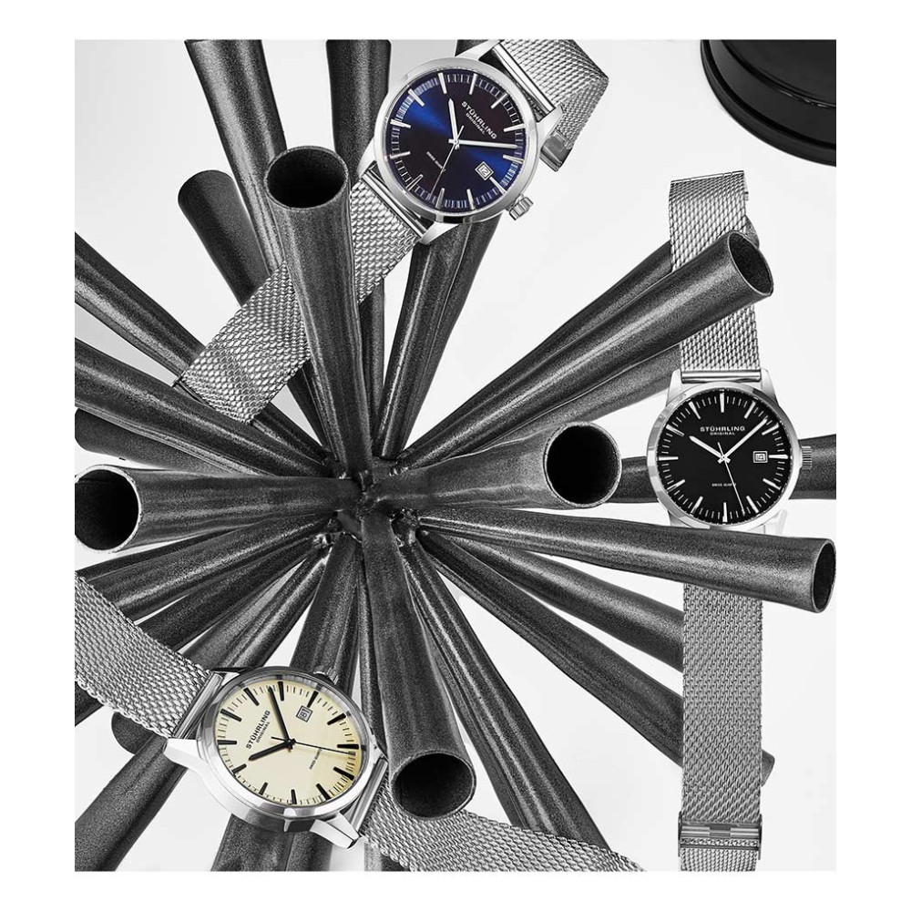 Relógio Masculino Stuhrling Ascot 555M Quartzo 42mm, Prata: Tamanho da Caixa 42mm Resistente à água 5 ATM 50 metros, 165 pés moldura polida Pulseira de malha de aço inoxidável de largura