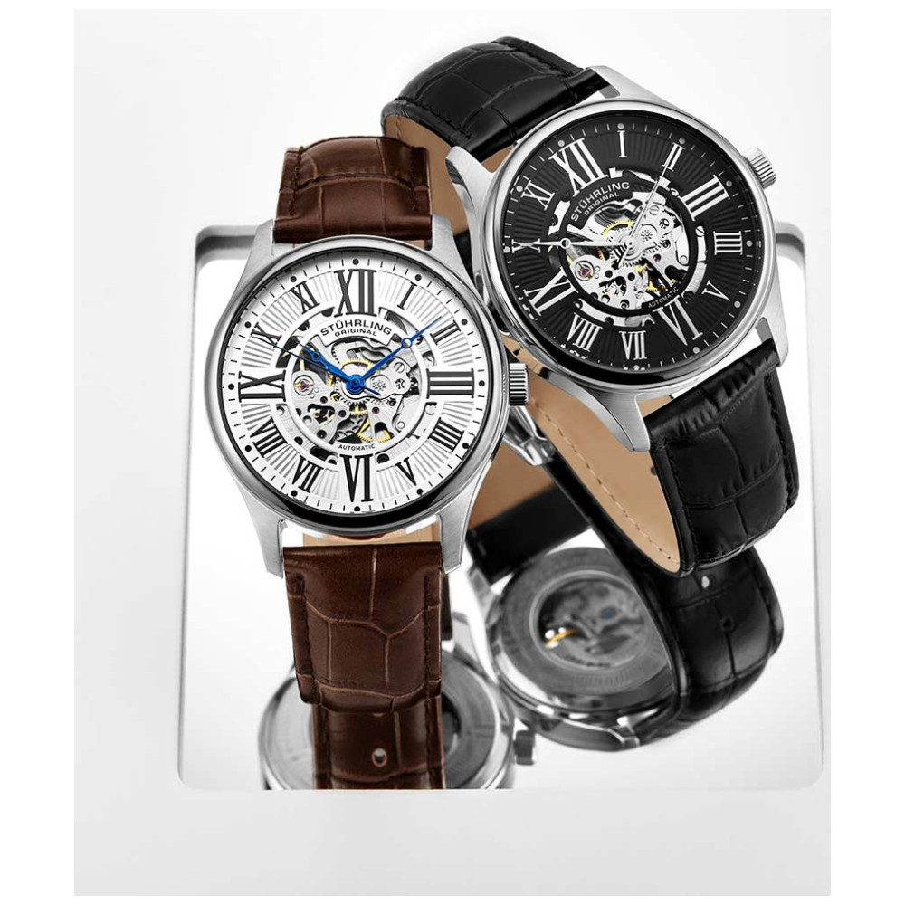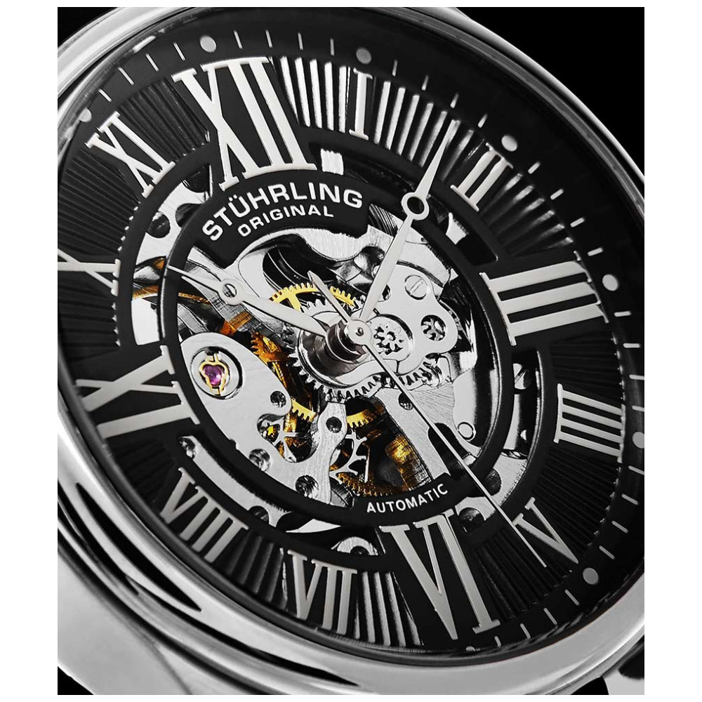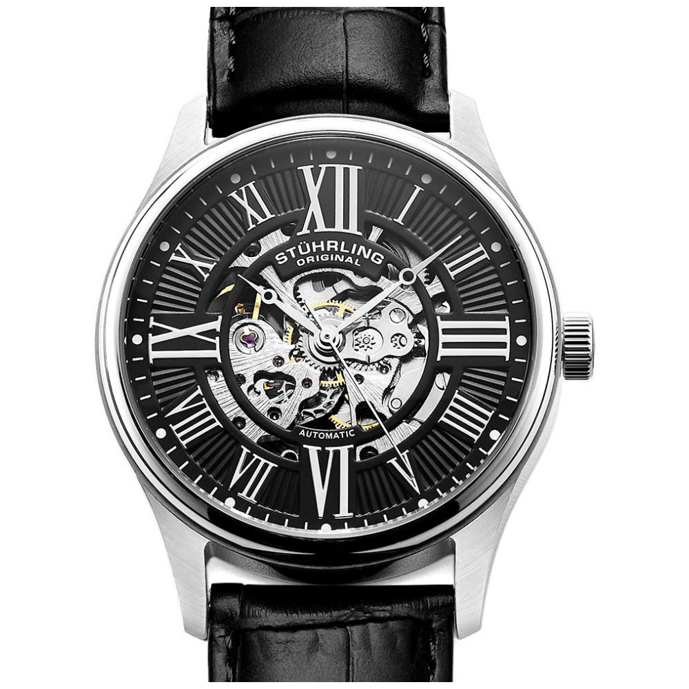 Relógio Masculino Stuhrling Atrium 3942 Automático 42mm, Preto: Caixa prateada automática masculina, bisel prateado polido, mostrador esqueletizado preto com tons dourados e detalhes em vermelho, ponteiros prateados, marcadores prateados, relógio com pulseira de couro em relevo de crocodilo preto
