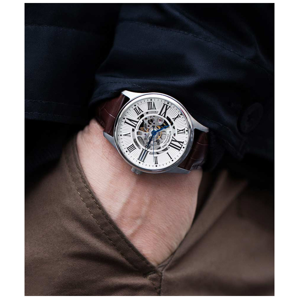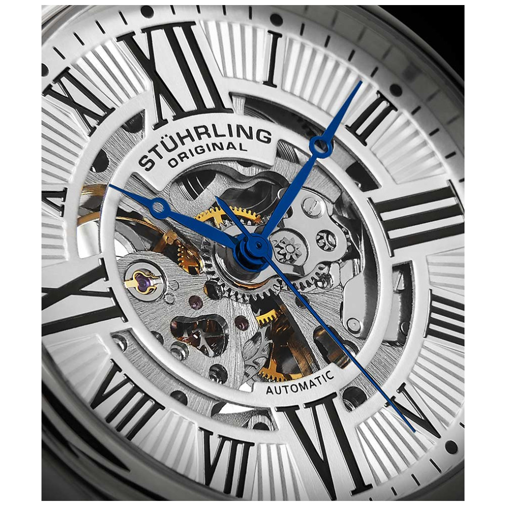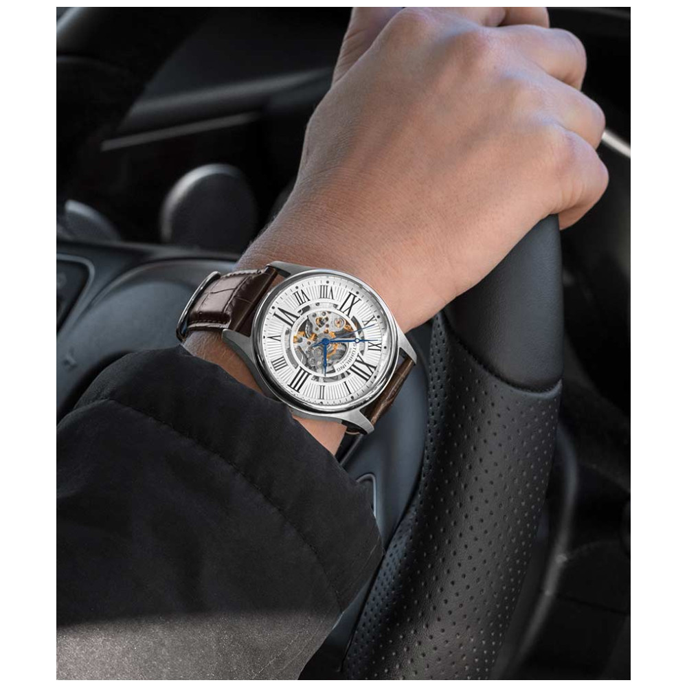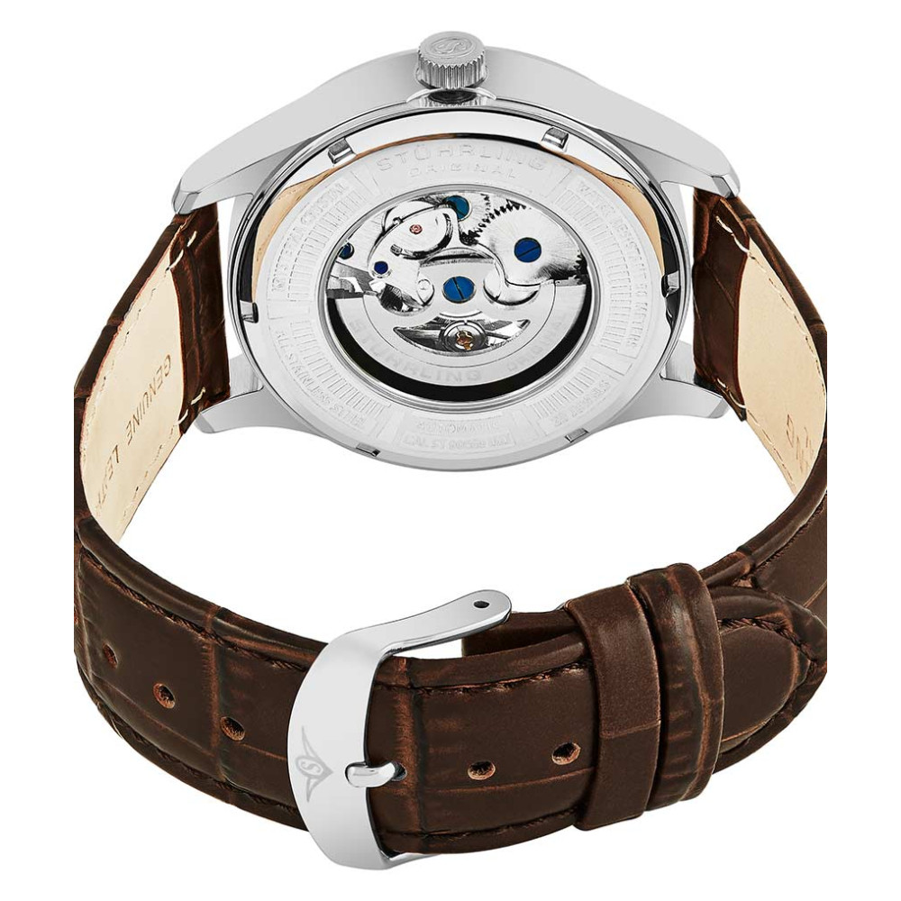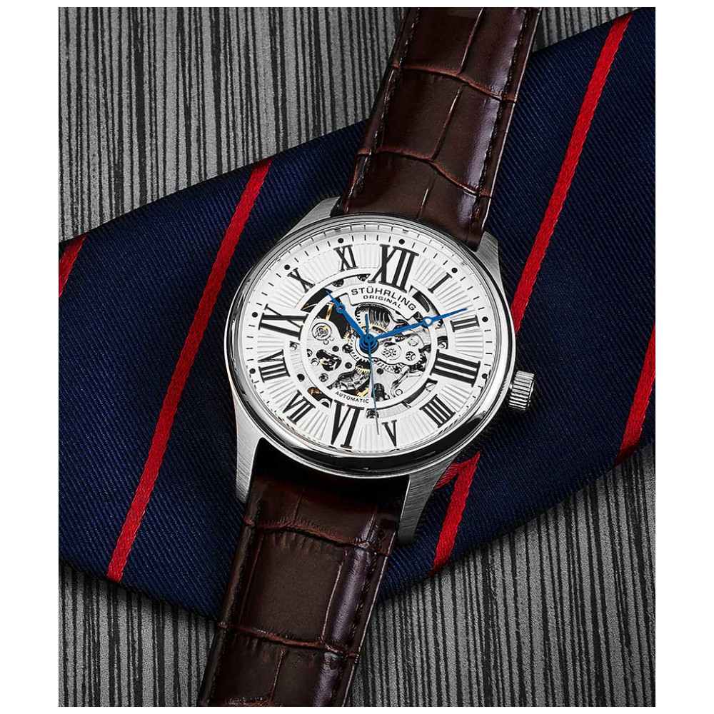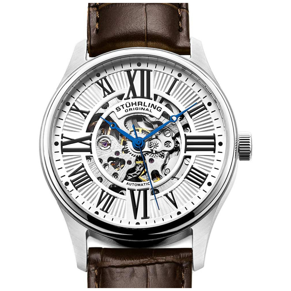 Relógio Masculino Stuhrling Atrium 3942 Quartzo 42mm, Marrom: Caixa prateada automática masculina, bisel prateado polido, mostrador esqueletizado branco e prateado com tons de ouro e detalhes em vermelho, ponteiros azuis, marcadores pretos, relógio com pulseira de couro em relevo de crocodilo marrom