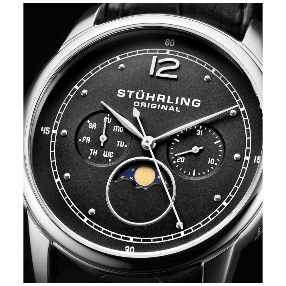 Relógio Masculino Stuhrling Celestia 898 Quartzo 39mm, Preto: Transcenda todos os dias com o Celestia, cujo mostrador animado da Fase da Lua move o céu e a terra para manter seu pulso em grande estilo.