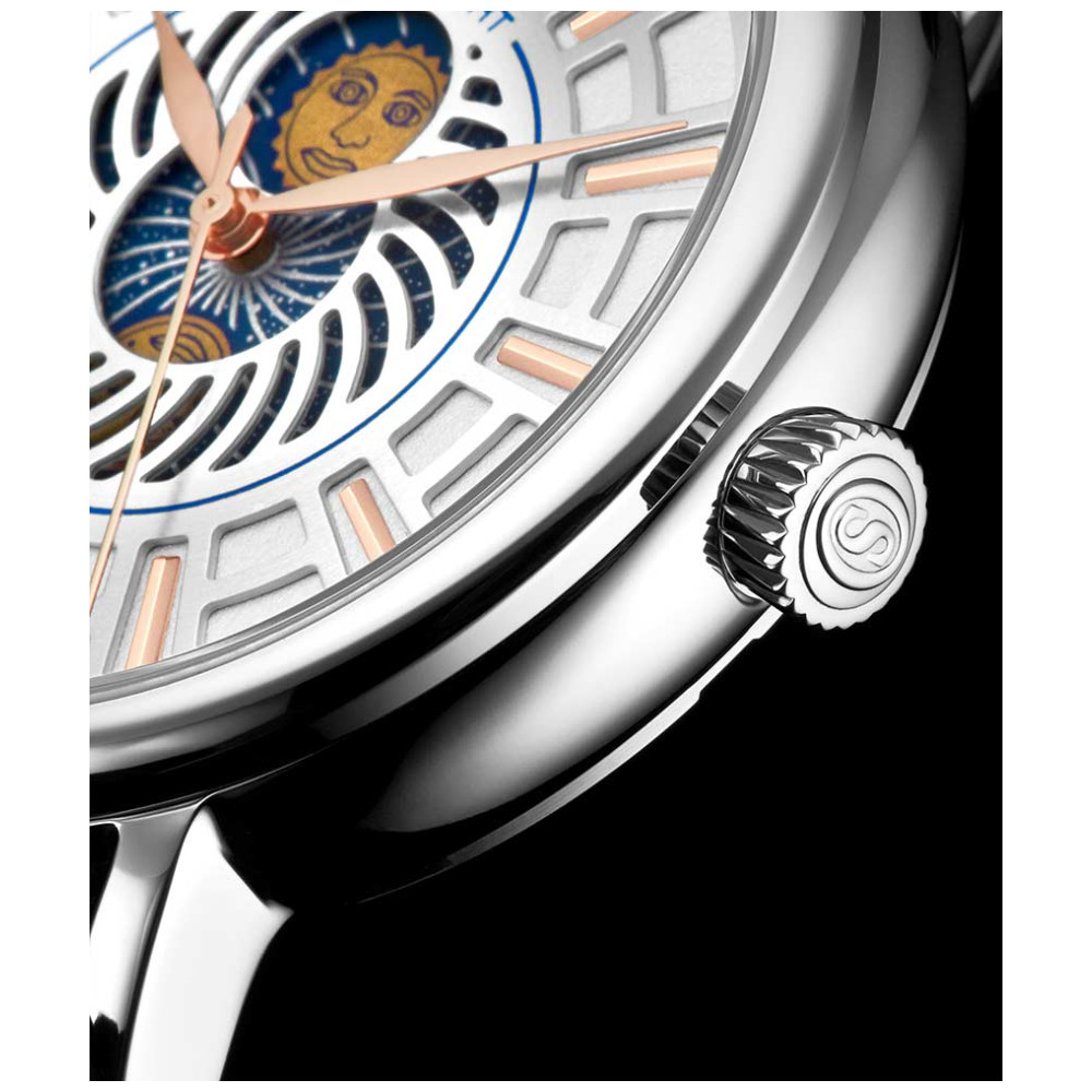 O complexo e cativante disco ilustrado no centro complementa os índices de bastão minimalistas e o bisel polido combinando para criar um relógio singular.