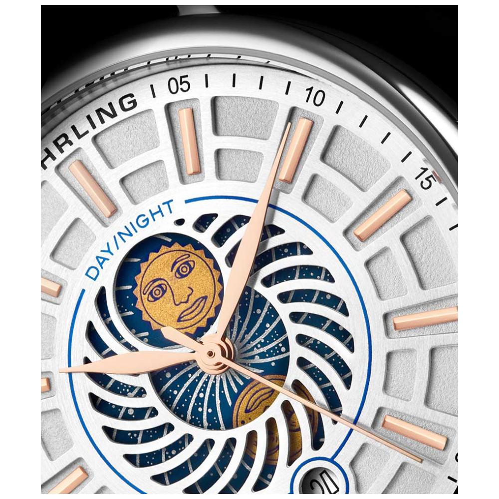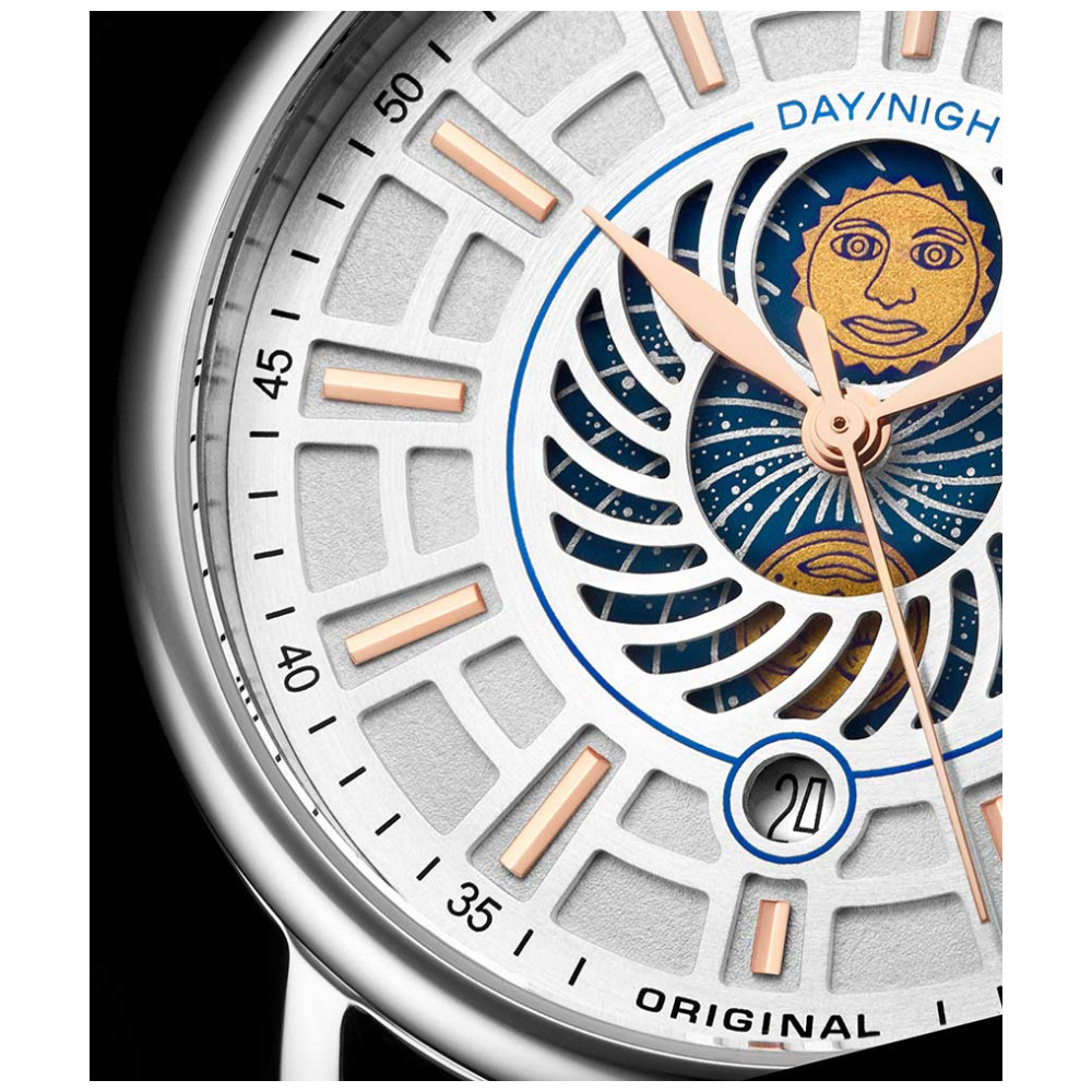 O impressionante mostrador Dia, Noite ilustrado no centro do Duet combina perfeitamente com elegantes ponteiros em estilo de folha e índices de bastão, criando uma exibição dramática que deslumbra tanto de dia quanto de noite.