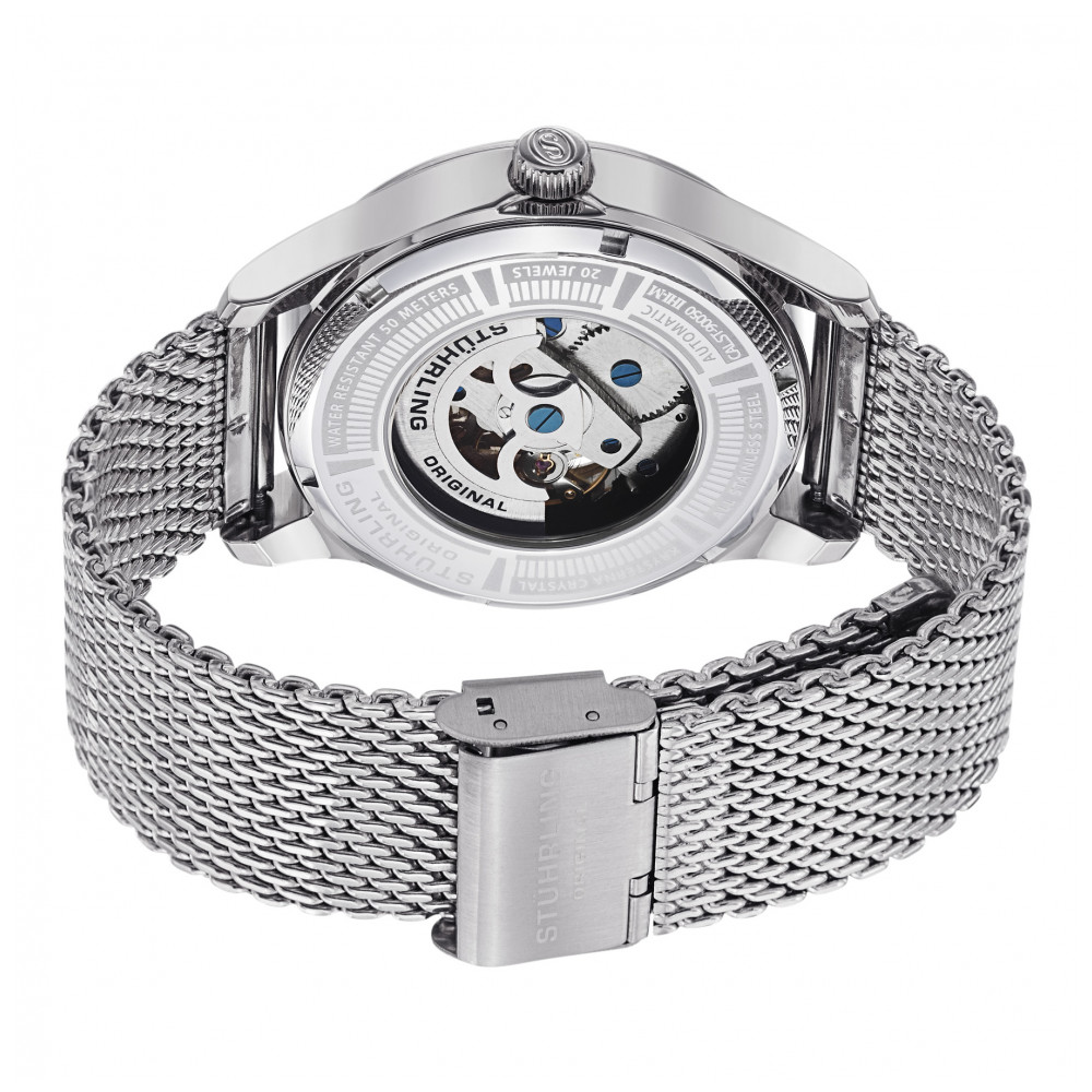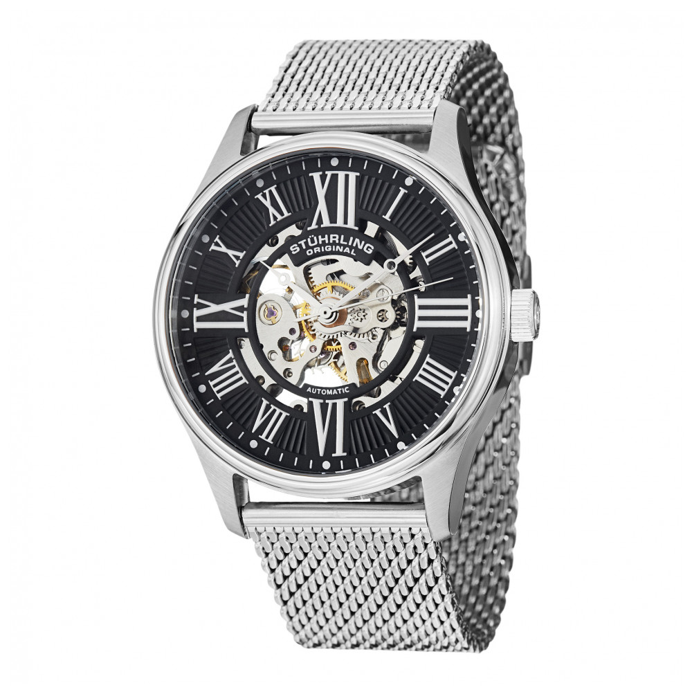 Relógio Masculino Stuhrling Elite 747M Automático 42mm, Prata e Preto: Caixa de aço inoxidável na pulseira de malha, mostrador esqueletizado preto, com detalhes em tom de prata