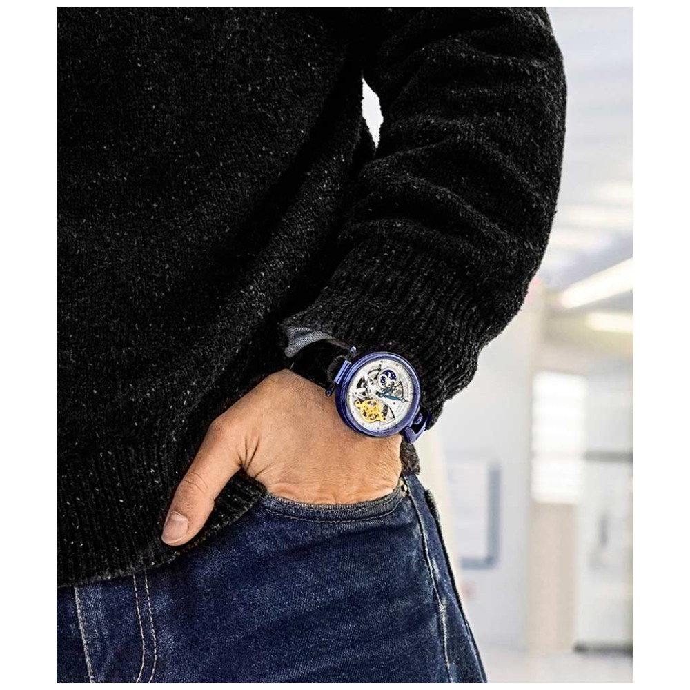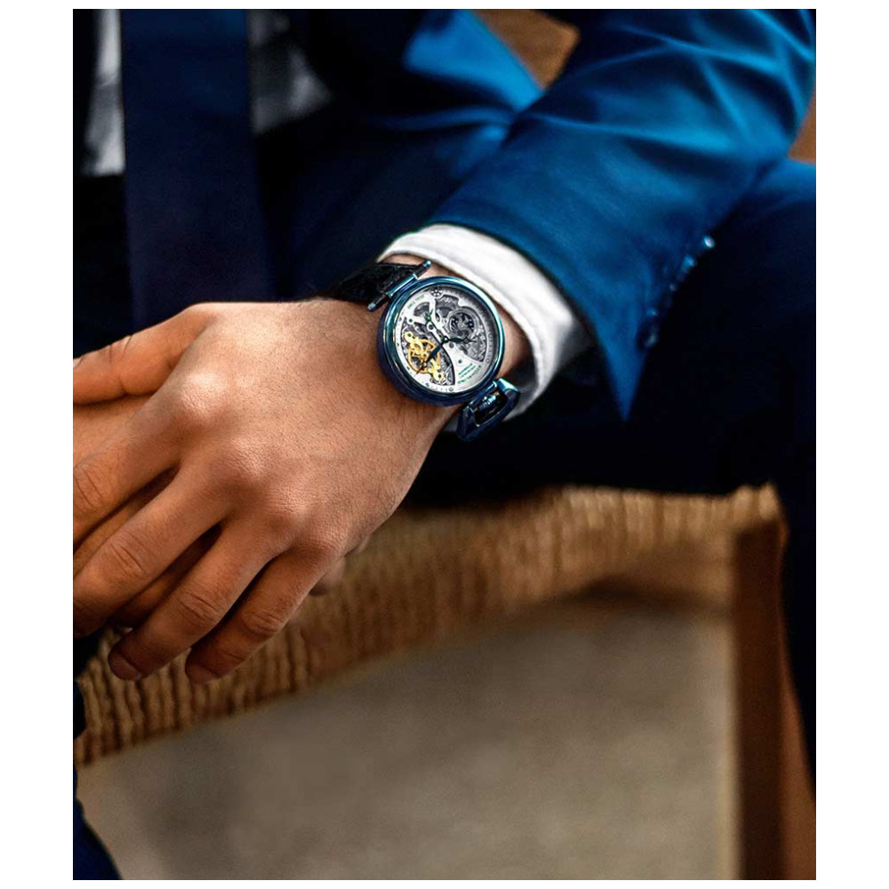 O indicador AM, PM animado e o segundo submostrador de fuso horário combinam perfeitamente com o mostrador esqueletizado, com uma coroa em forma de cebola e protetor de coroa às 12 horas para completar a experiência.