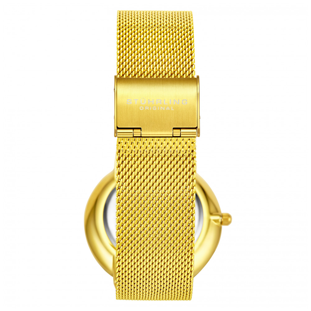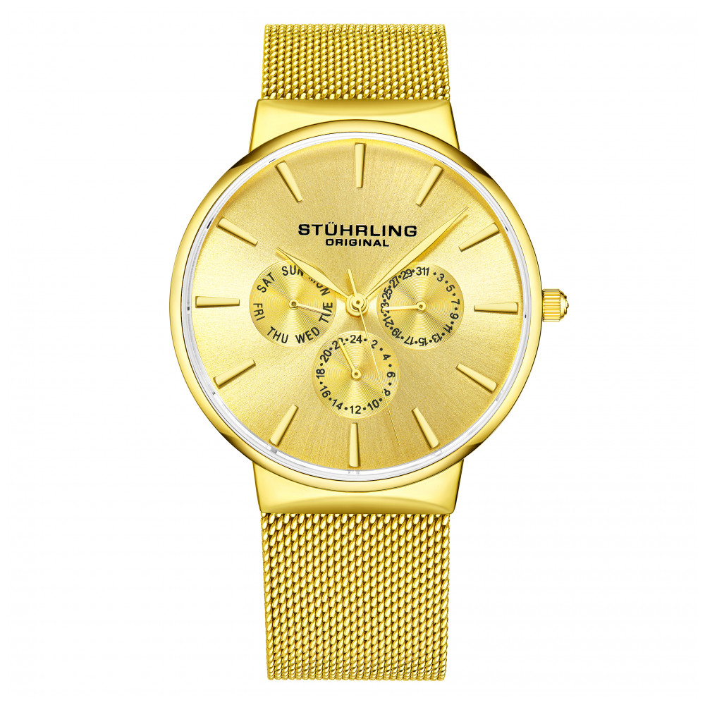 Relógio Masculino Stuhrling Monaco 3931 Quartzo 39mm, Dourado: Caixa dourada multifuncional de quartzo masculino, mostrador dourado, relógio com pulseira de malha dourada