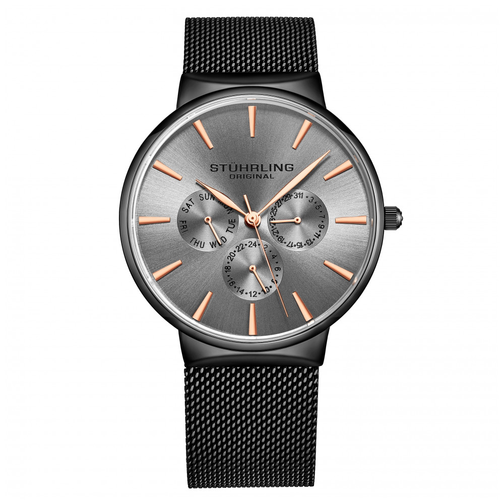Relógio Masculino Stuhrling Monaco 3931 Quartzo 39mm, Preto: Caixa masculina cinza metalizado multifuncional de quartzo, mostrador cinza metalizado, relógio com pulseira de malha cinza metalizado