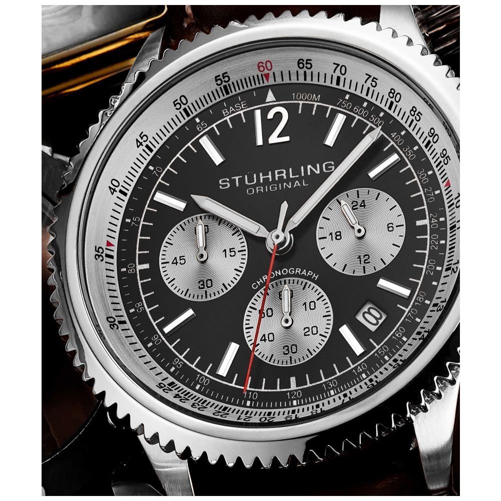 Relógio Masculino Stuhrling Monaco 4015 Quartzo 44mm, Preto: Tamanho da Caixa 44mm Resistente à água 5 ATM 50 metros, 165 pés Moldura fixa com borda de dentes de tubarão polido Aço inoxidável