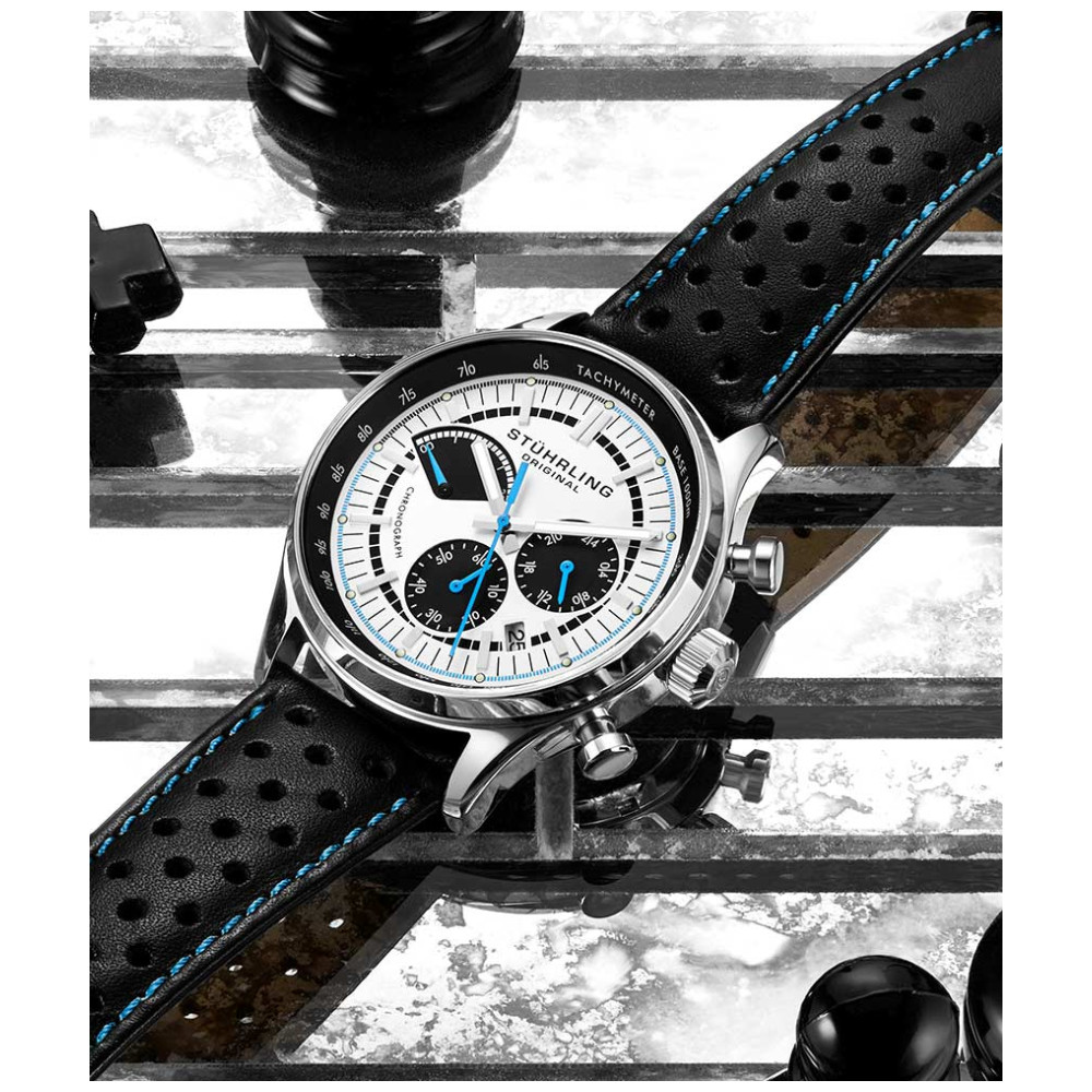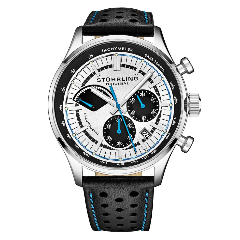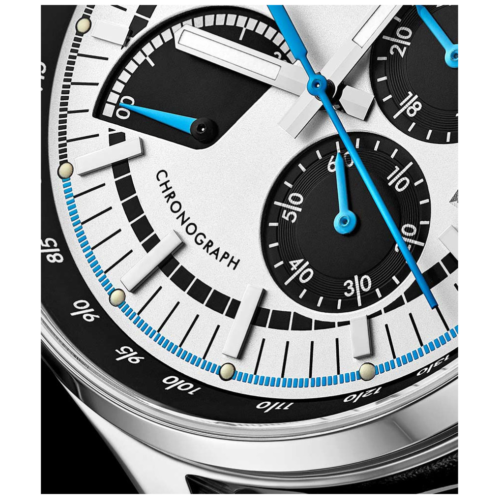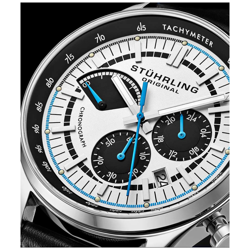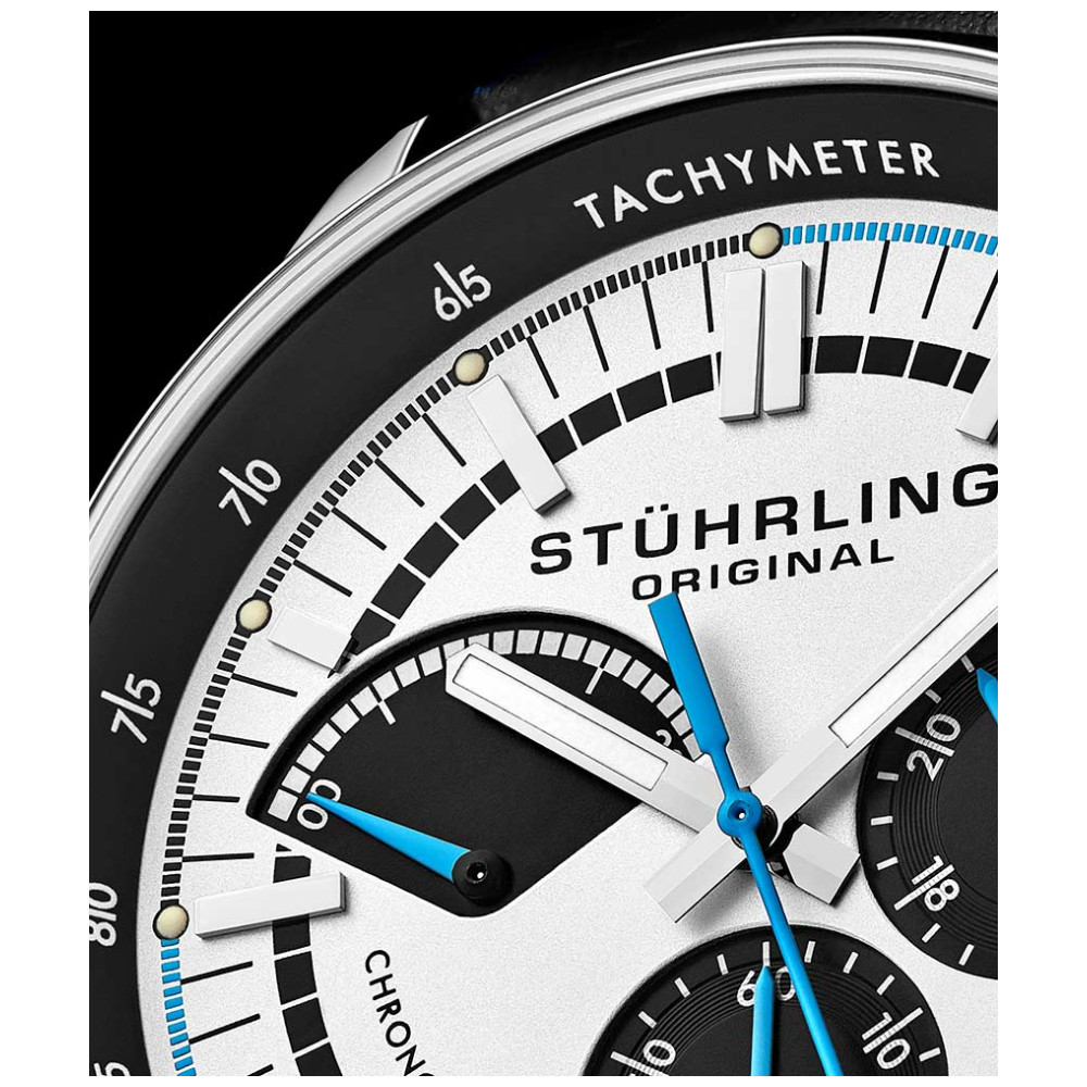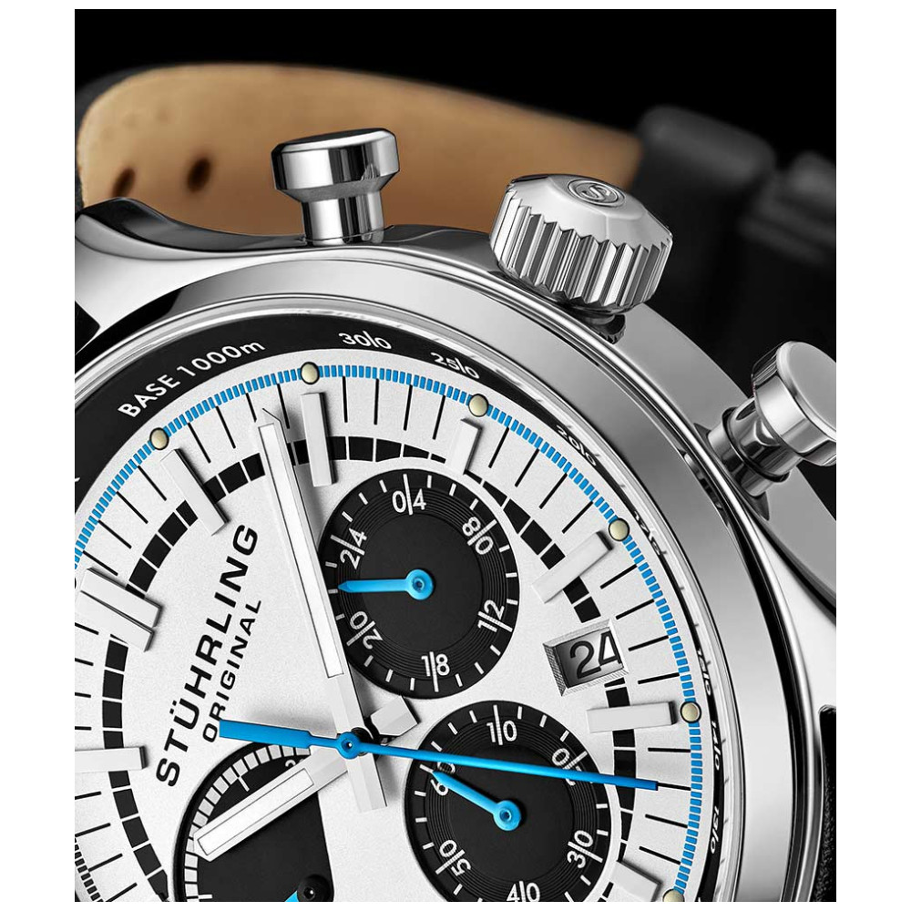 O poderoso movimento de quartzo japonês VK83 controla o submostrador de 24 horas e o atraente contador de cronógrafo retrógrado de 20 minutos.