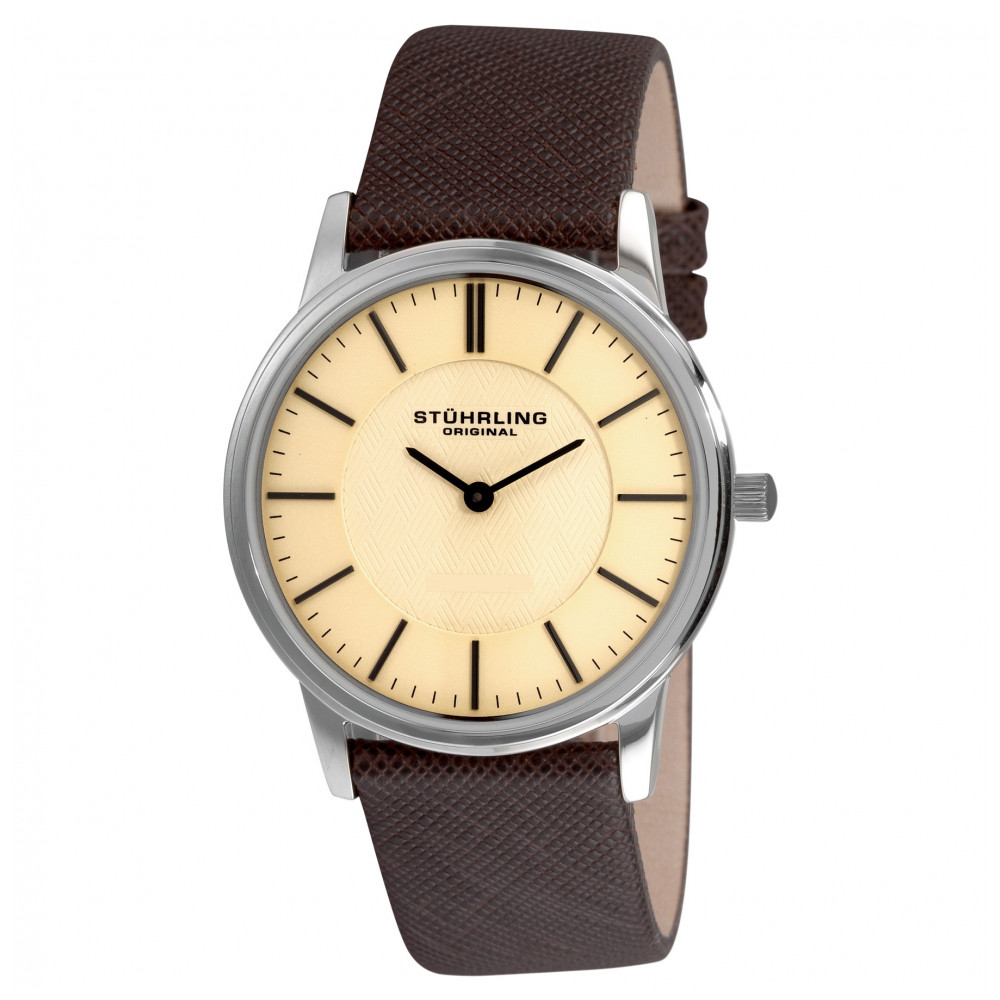 Relógio Masculino Stuhrling Newberry 238 38mm, Marrom: Tamanho da Caixa 38mm Resistente à água 5 ATM 50 metros, 165 pés Moldura com design de passo polido Correia cônica de couro francês ou pulseira de malha de aço inoxidável nas alças
