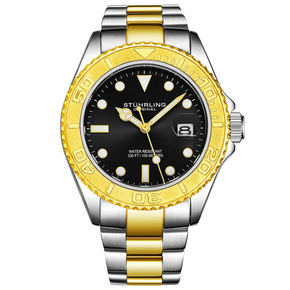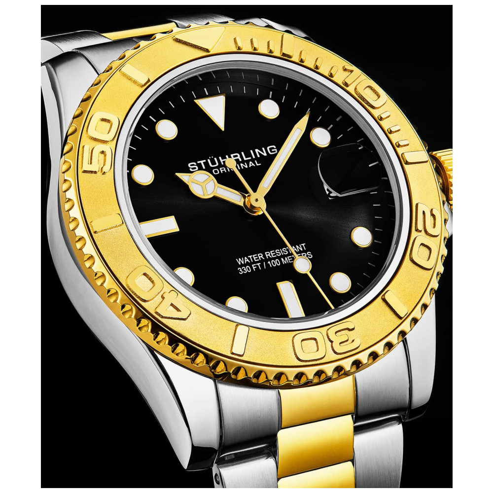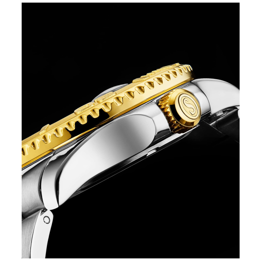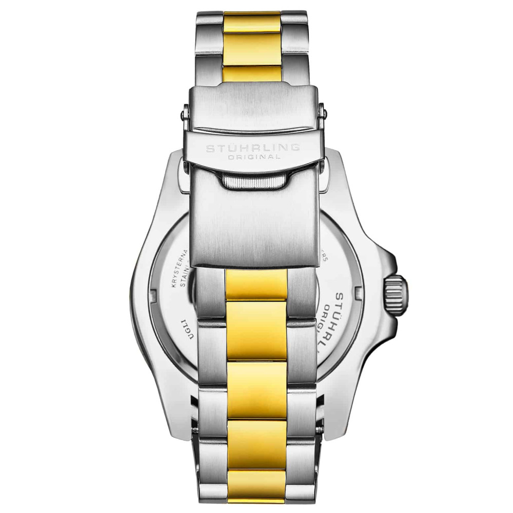 Relógio Masculino Stuhrling Oceana 3967 Quartzo 42mm, Prata e Dourado: Vista se para cima ou para baixo, a Oceana é versátil com o seu estilo Este mergulhador de quartzo tem uma pulseira de elos e botão de pressão de aço inoxidável implantado com fecho de segurança.