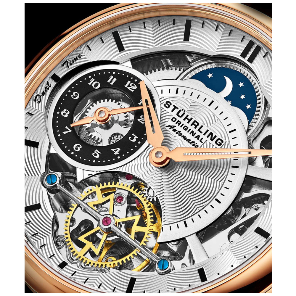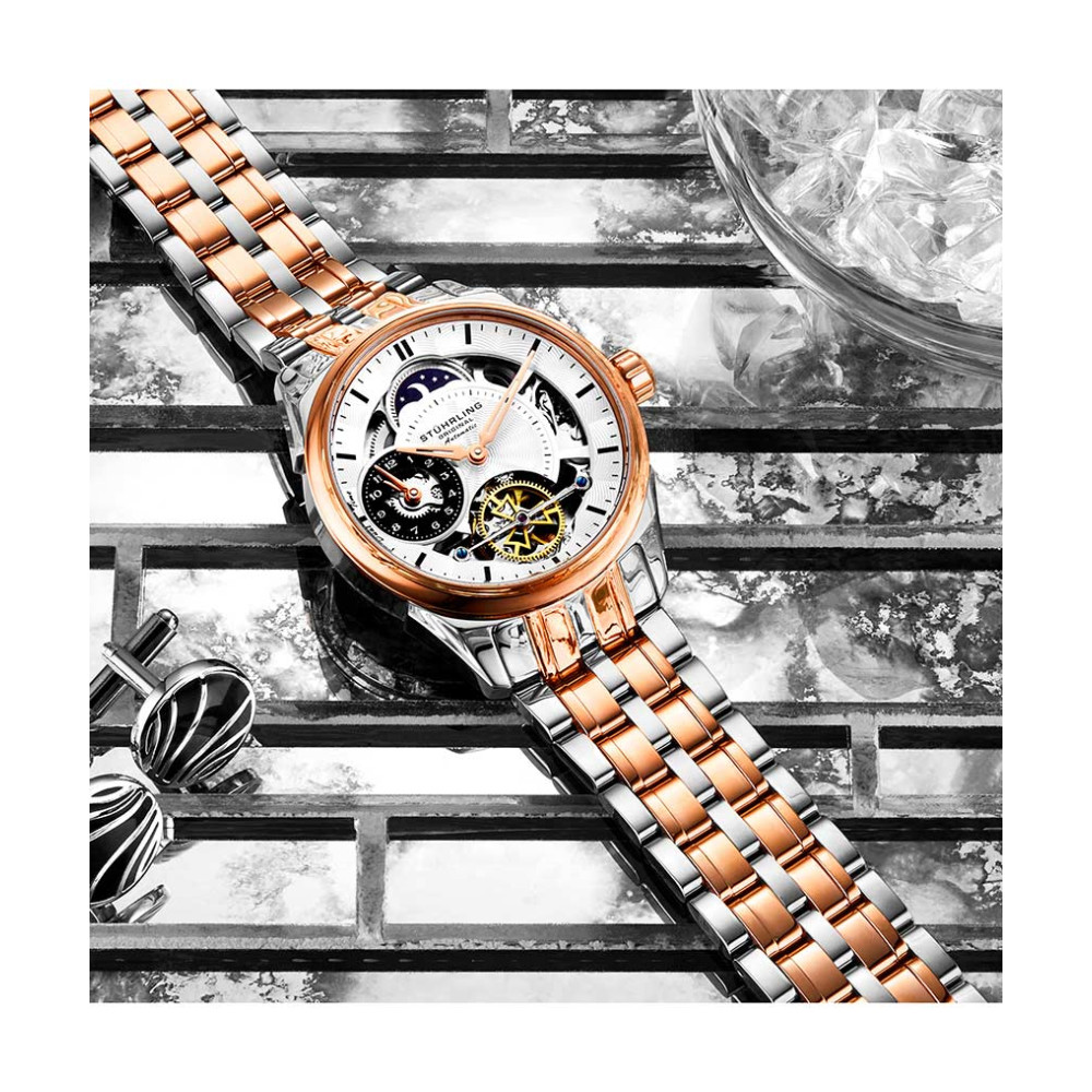 Relógio Masculino Stuhrling Presidia 943B Automático 42mm, Prata e Ouro Rosa: Reine sobre seu domínio com o poder de horário duplo automático do Presidia 943B.