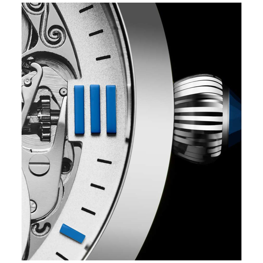 Perca se nos detalhes do indicador AM, PM animado, submostrador de segundo fuso horário com ponteiros em estilo de folha combinando e apresentação do mostrador esqueletizado.